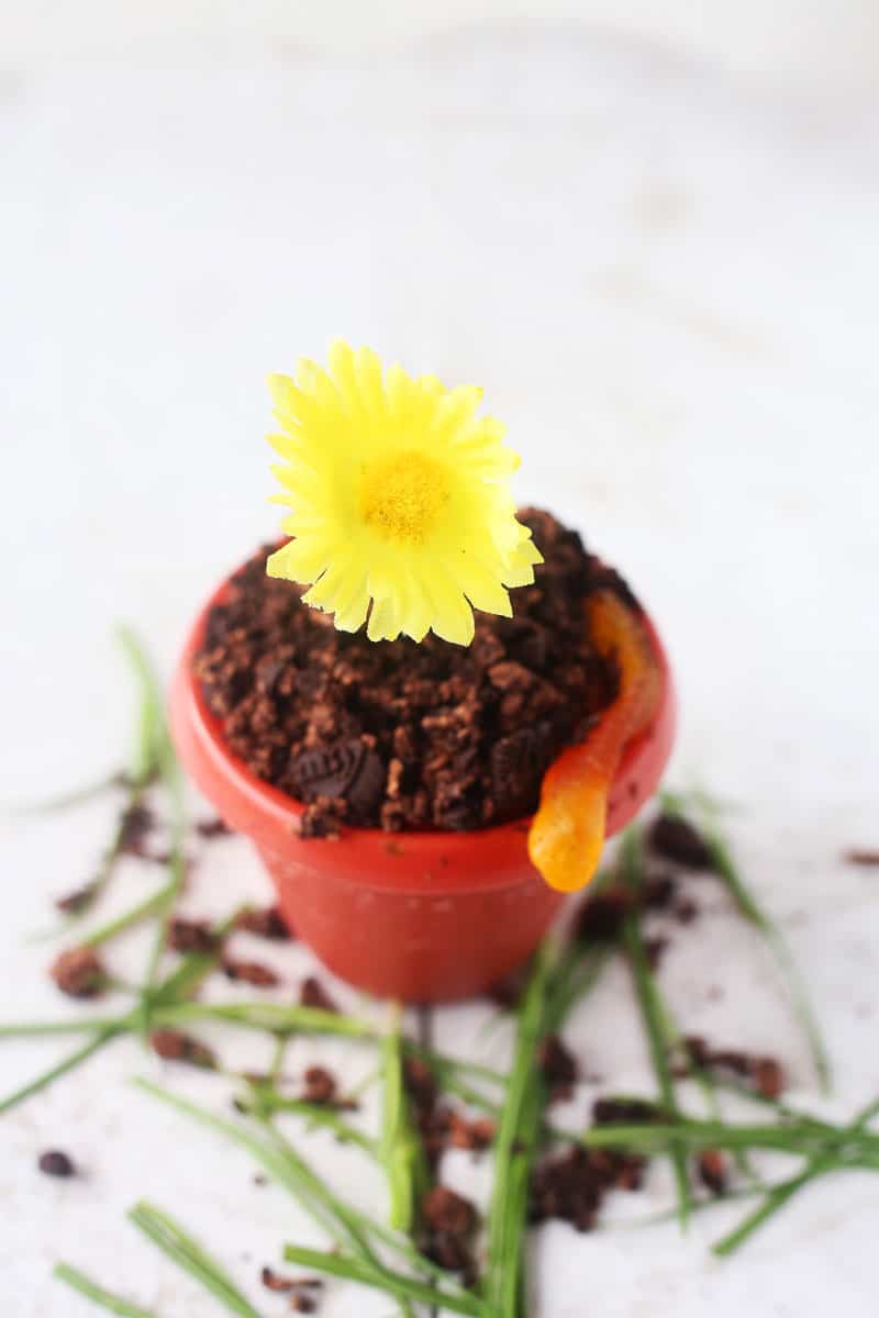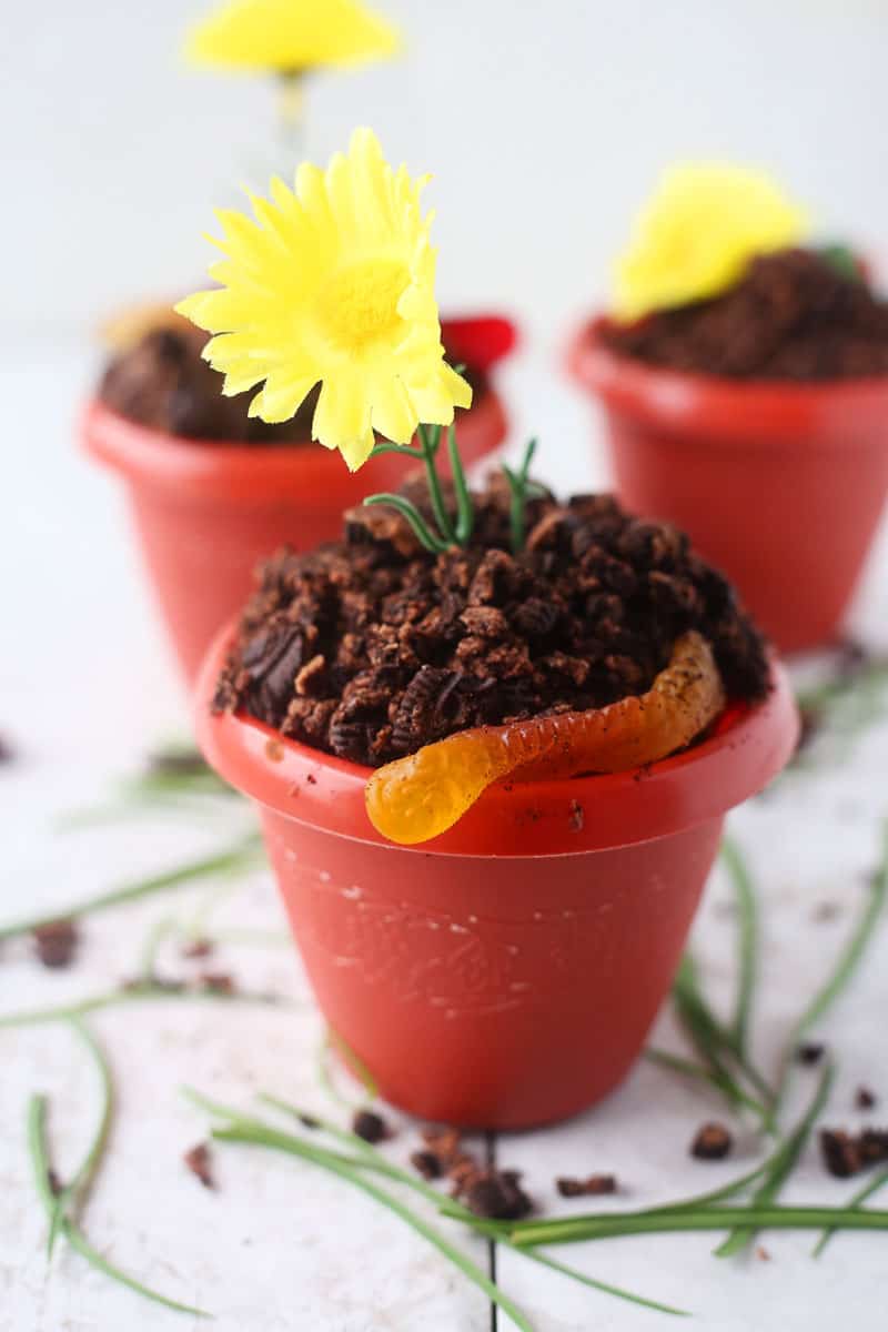 These Dirt and Worm Cupcakes are absolutely adorable. You can put these cupcakes in plant pots, cover in crush chocolate cookie crumbs, and a gummy worm.