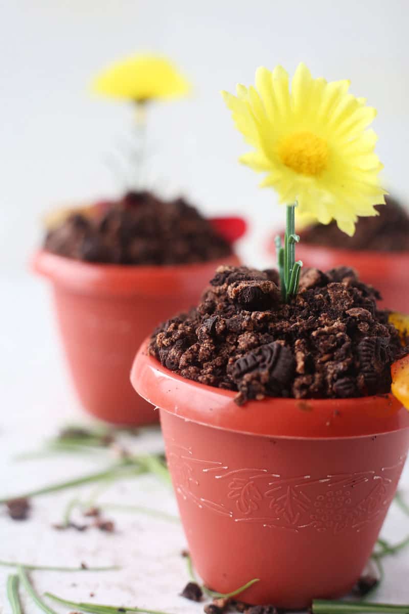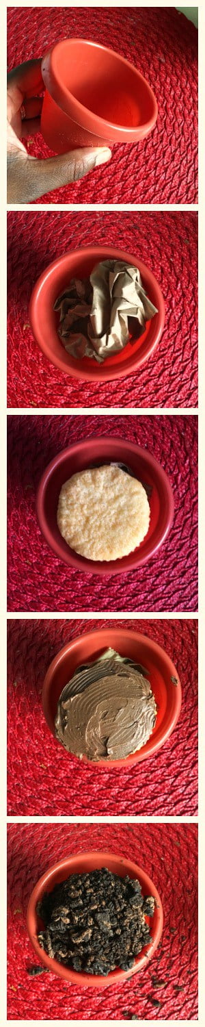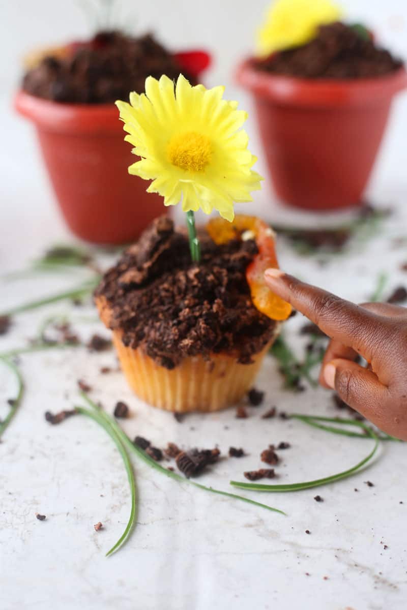 - NOTES: If you want the flower pot to affect, what I did was bought some plastic pots, stuffed them midway with brown paper bag paper that I rolled into a ball; I placed the cupcake securely on top of the brown paper bag; finally, top topped the cupcakes off with crushed chocolate cookies and the gummy worm as I mentioned earlier.