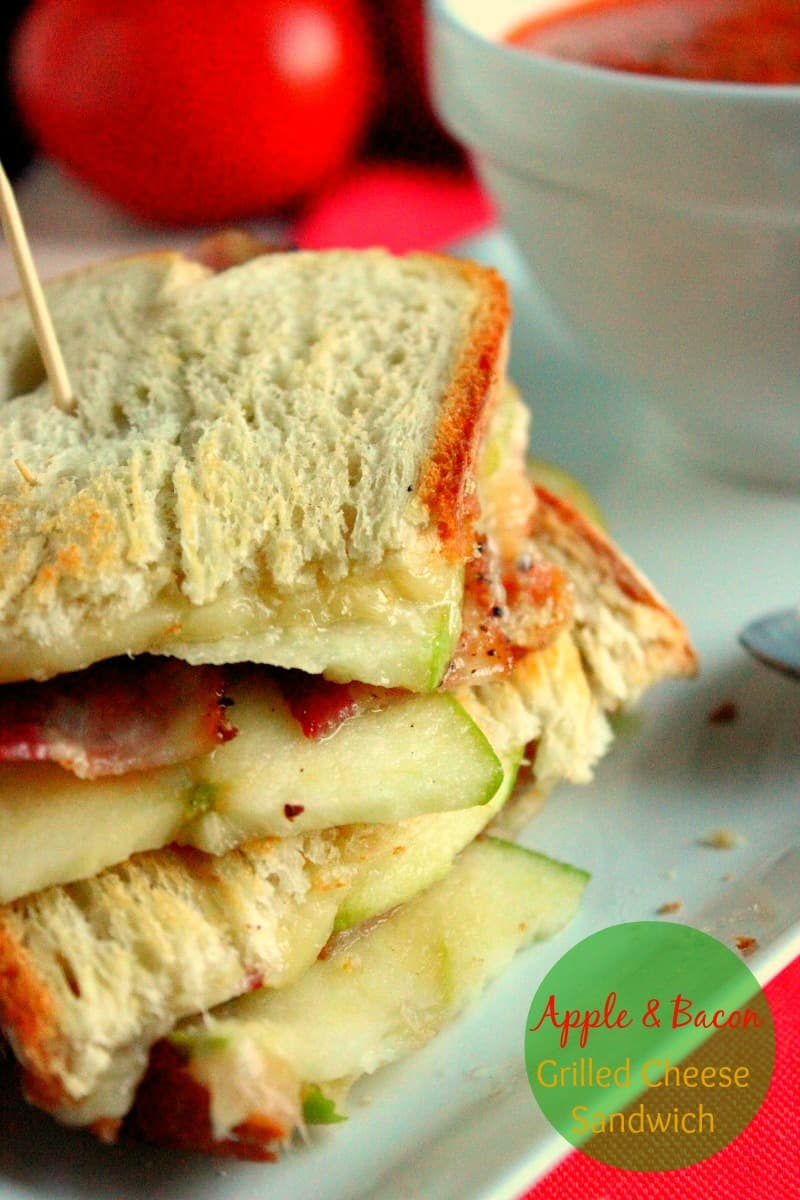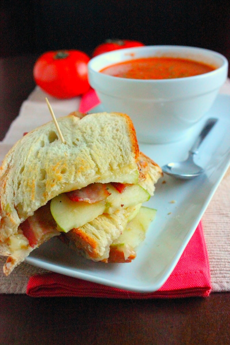 So the other day I made some Homemade Creamy Tomato Soup. A nice bowl of soup to help fight against the cold is a good comfort meal if you as me. Of course, I would be doing you all a huge disservice if I didn’t give you a great idea for something to dip inside of the tomato soup, right?! Right! Tomato soup isn’t tomato soup without a grilled cheese sandwich. I didn’t want to make just any kind of grilled cheese sandwich. No! I wanted to make something so wonderful, so beautiful, so outside of the box, something that will make you say “Shut up Nicole and just give me the recipe already” good that it makes you want to, not only want to smack your momma, but your husband too! That is when it hit me! How about combining salty and sweet and make a Apple & Bacon Grilled Cheese Sandwich with Gruyere Cheese! WHAT THE WHAT SON! Oh yea, I did that.