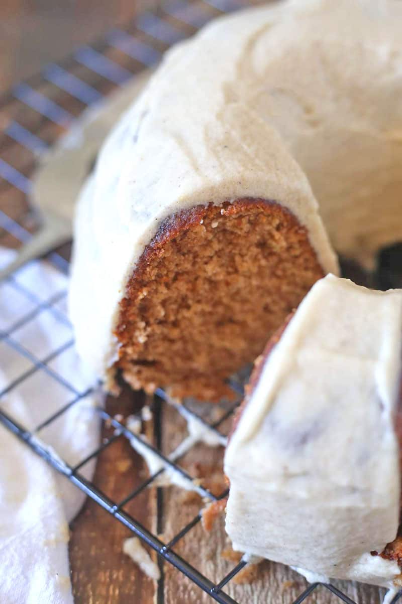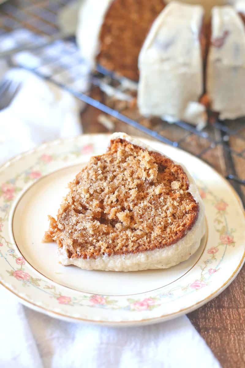 This Apple Spice Cake is made with real apples. I used Honey Crisp Apples because I think it’s pretty potent of apple flavor and they’re my favorite apple, to be honest. I used a regular cheese grater to grate the apples finely. You don’t have to squeeze the apples afterward. All of that flavor is going to get baked into the cake. You will definitely appreciate it after your first bite.