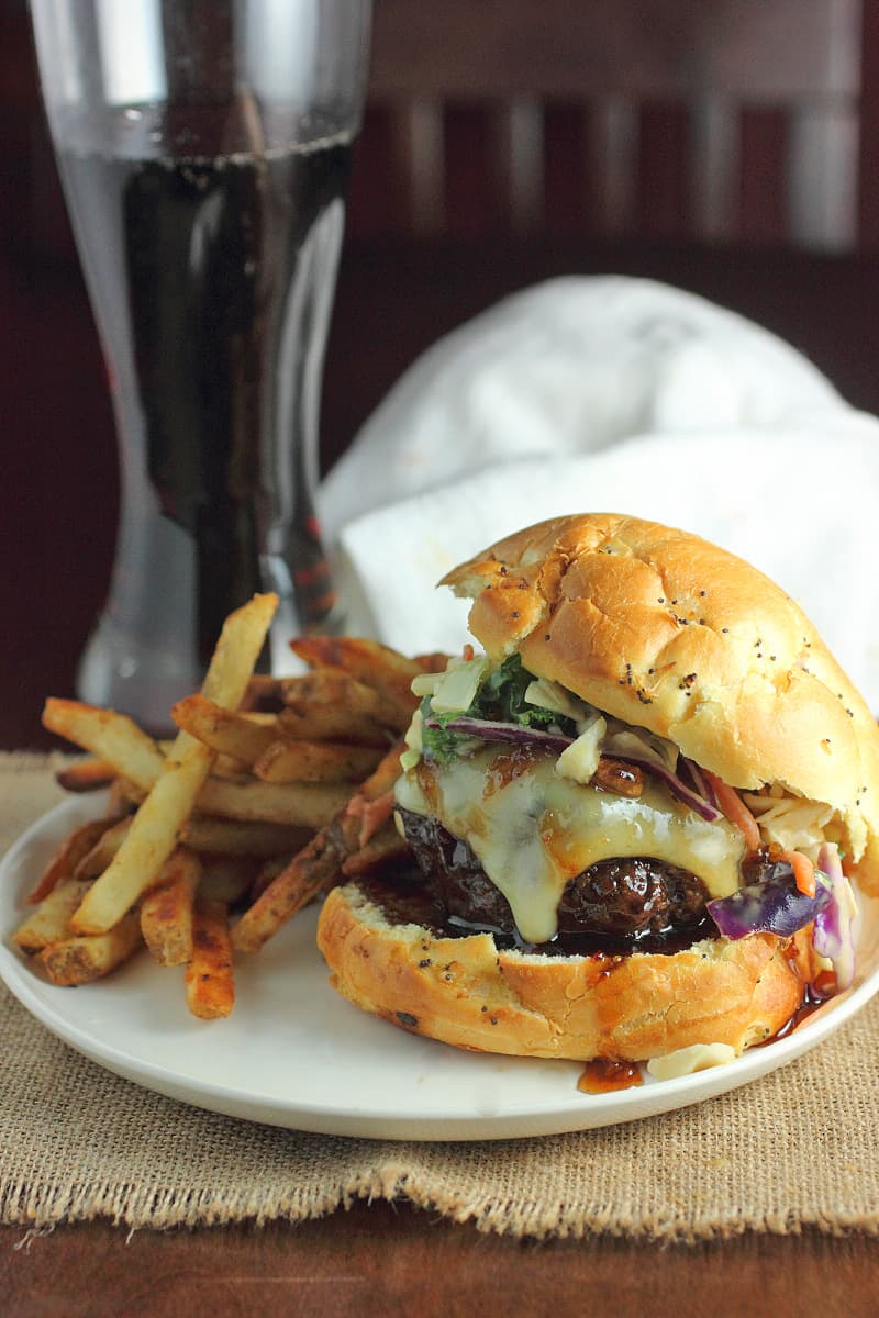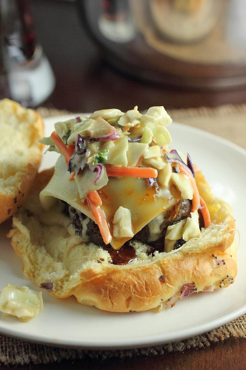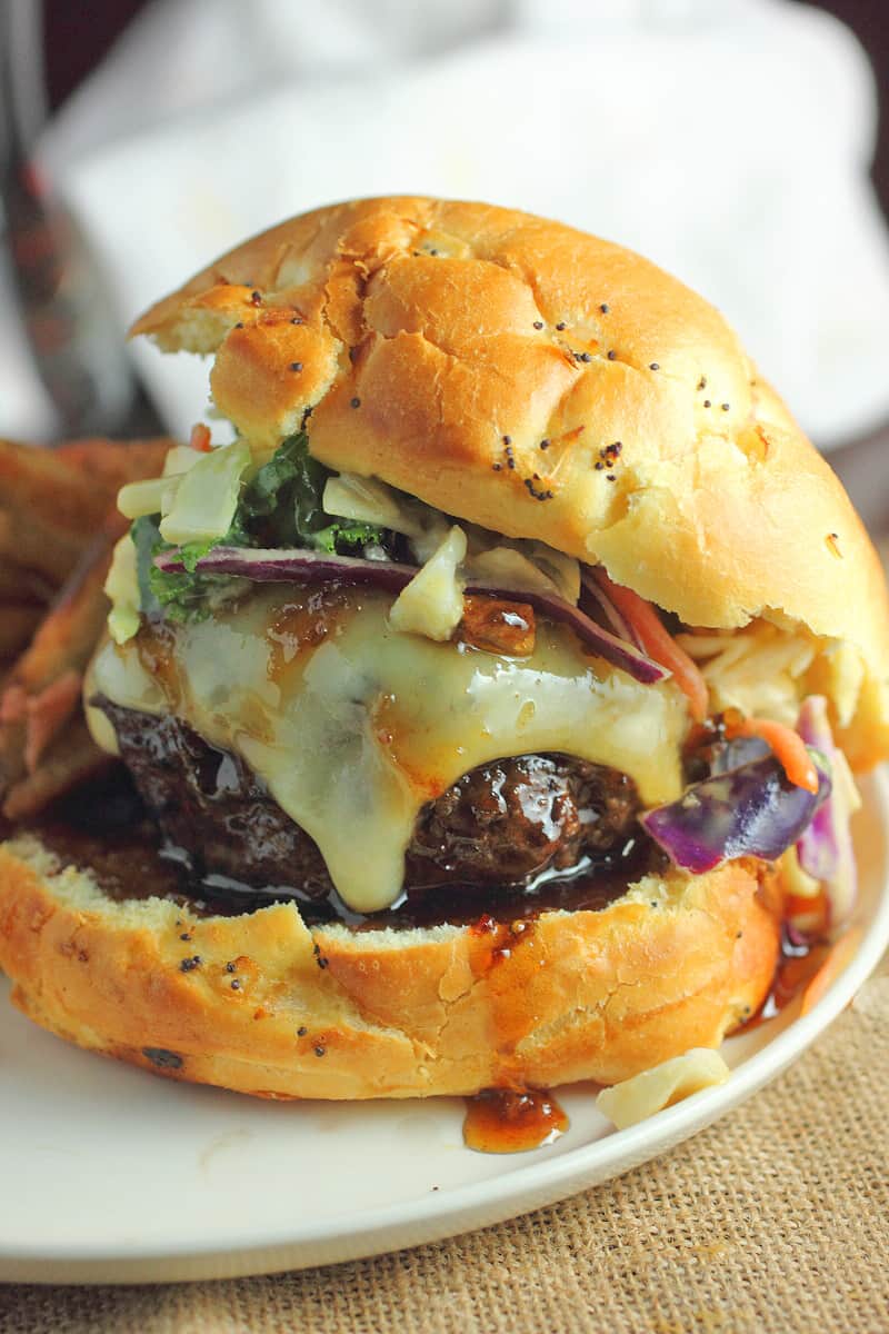Let’s talk about these burger for a second, shall we? I love, love burgers. Oh wait, I said that already. I wanted to make a burger that would make you want to write a grocery list of the ingredients for this burger and make immediately. I seasoned the burger meat with some of your most basic seasonings, topped it off with Swiss cheese and Asian Cole Slaw. The star of the burger is the sauce. It is so simple and packs so much flavor that it is ridiculous. It is sweet with a nice spicy kick and full of Asian inspired flavors from the ginger, soy sauce, and Anise. I am promise, you will love the recipe.