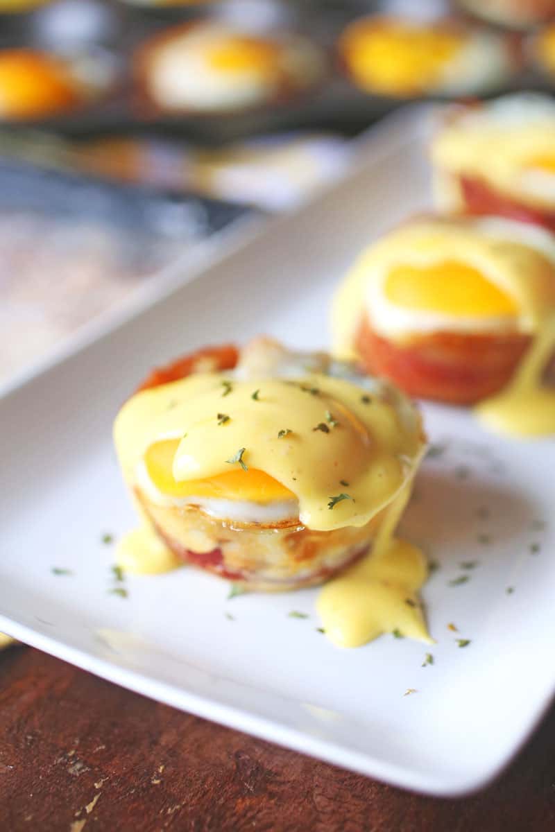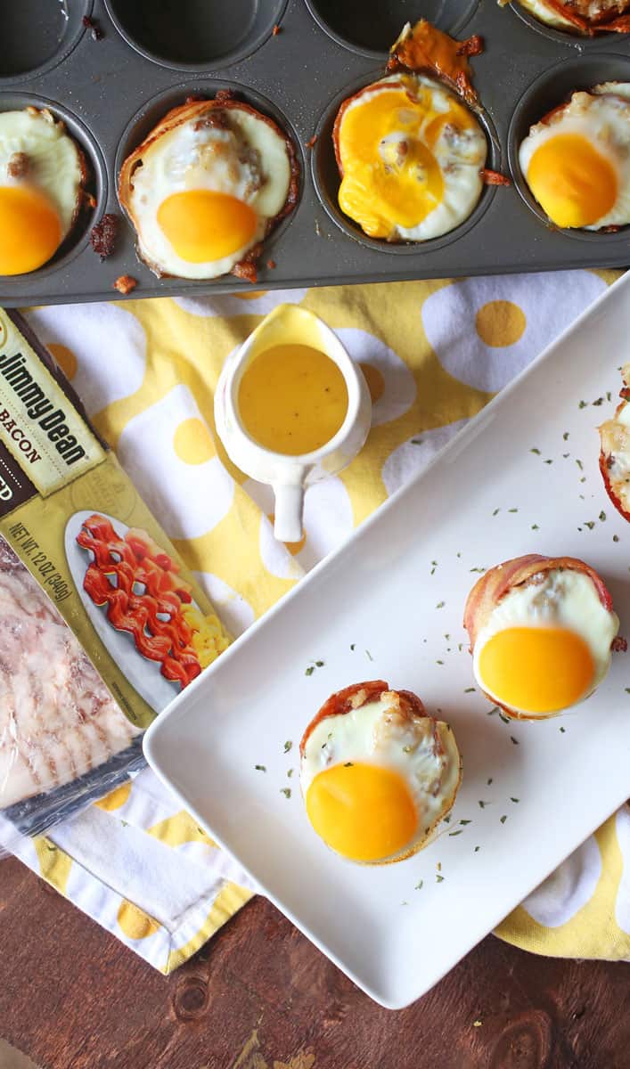The breakfast cups are made with Jimmy Dean smoked bacon and sausage made with original spices. These breakfast cups are wrapped in bacon, stuffed with potatoes, topped with an egg, and drizzled in hollandaise sauce.