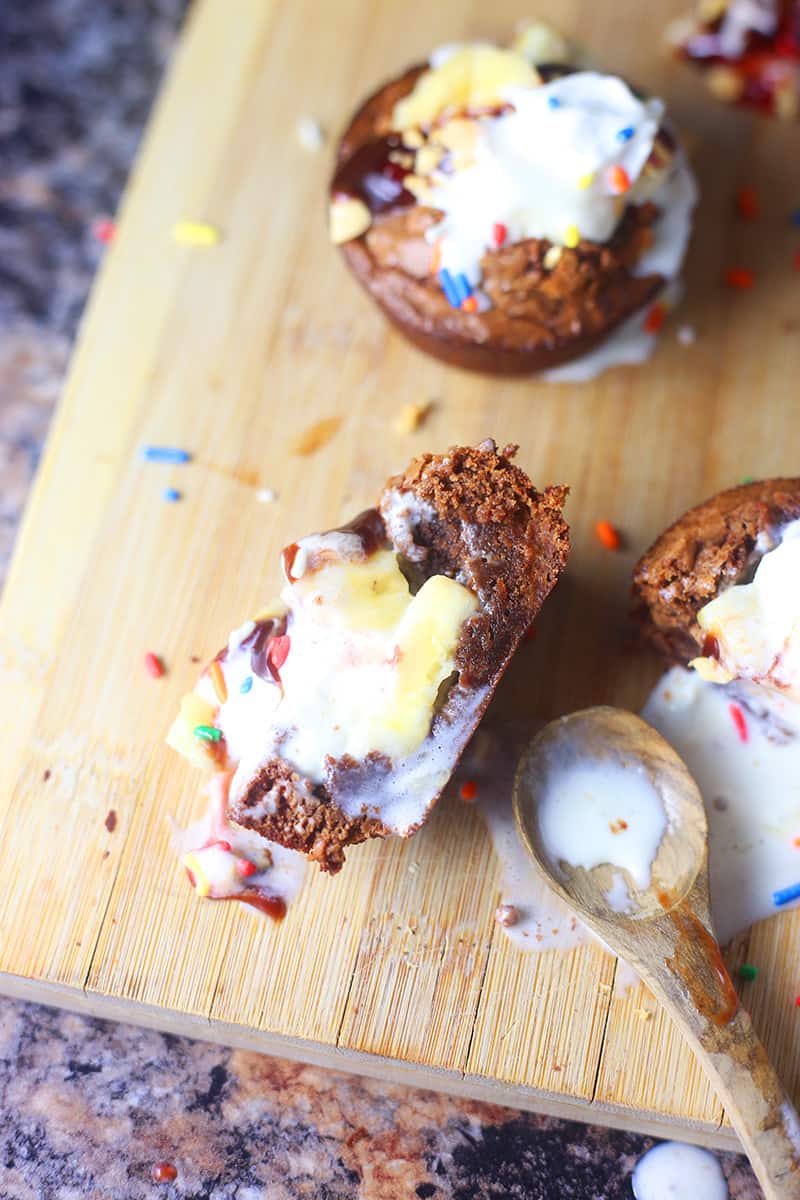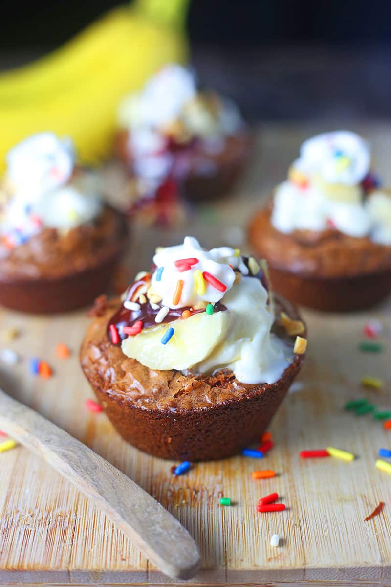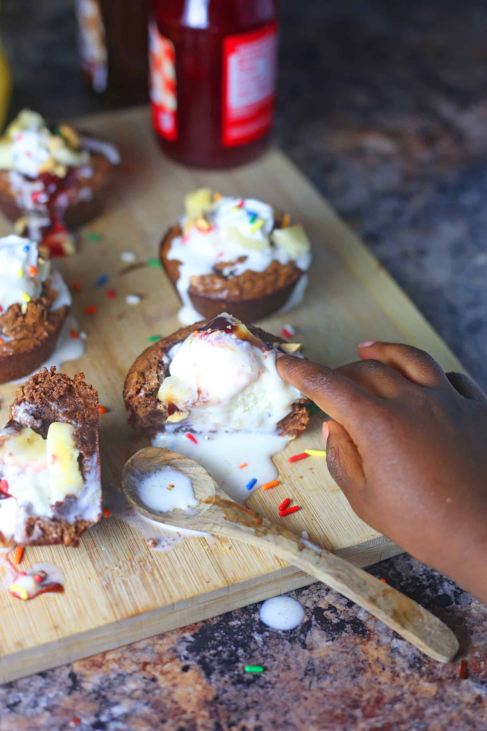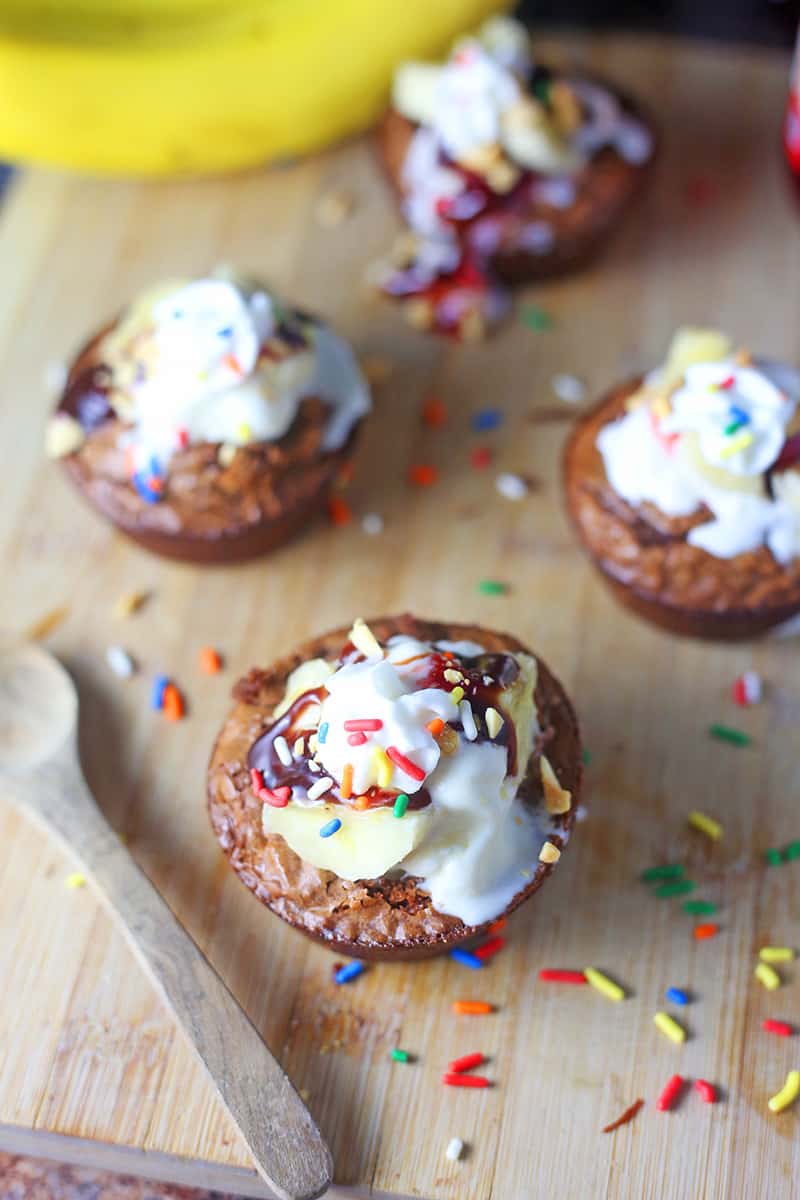 Making these Banana Split in a Brownie Bowl is relatively easy. All you do is make brownies from a box and bake them in a muffin pan. Once the brownies have finished baking, you’re going to allow them to cool. Then you’re going to make a hole in the middle of the brownie and begin to fill it with diced bananas, ice cream, and top it off as you wish. This is a perfect dessert to allow your kids to make as they want.