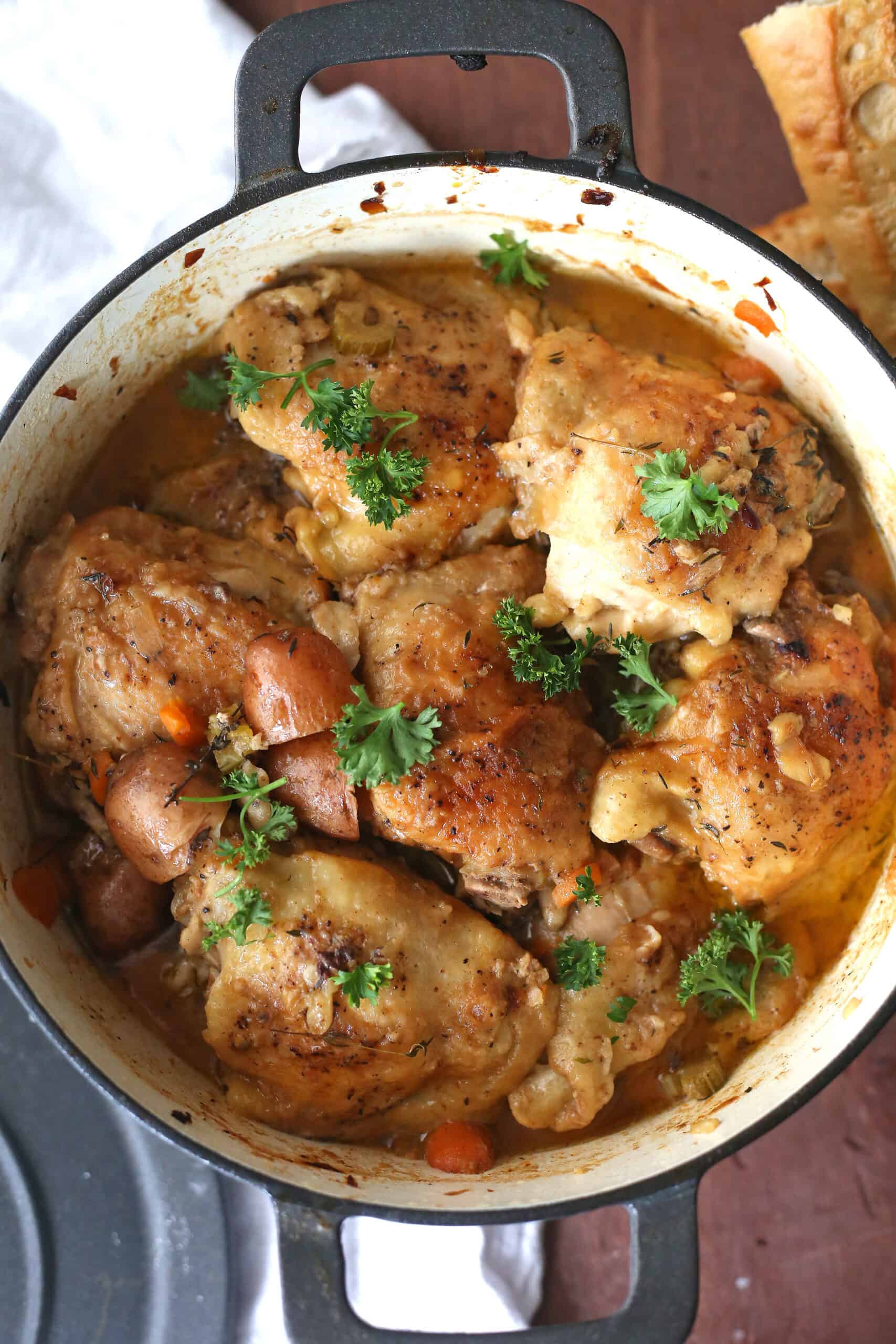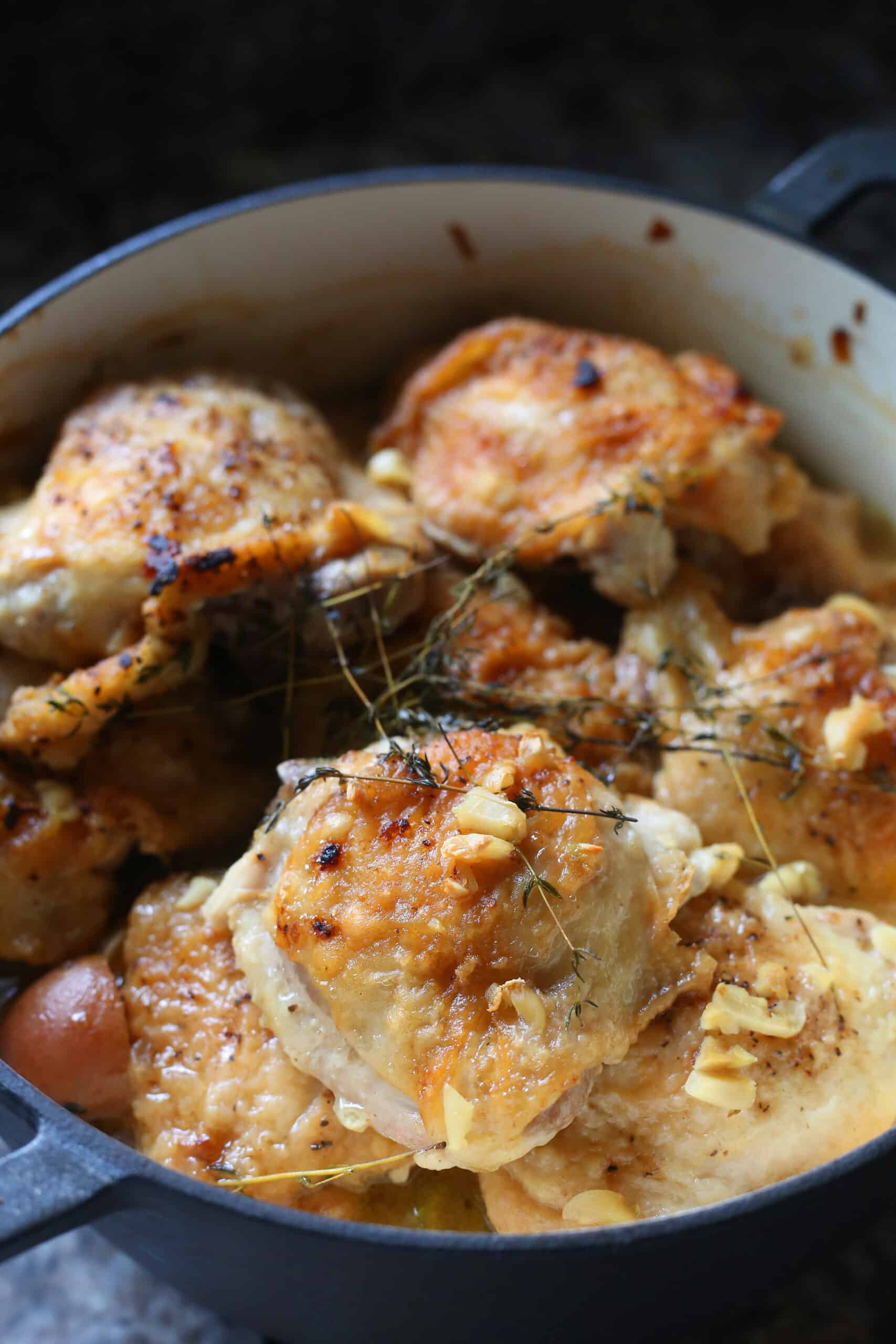 Cook for 30 minutes – Add the thyme on top of the chicken thighs. Place the lid on top of the thighs and into the oven for 30 minutes. Then remove the lid and cook for 15 minutes uncovered.