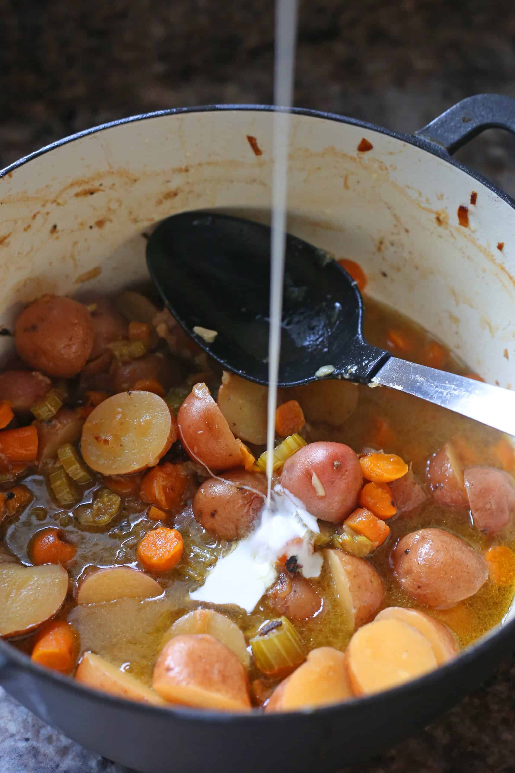 - Remove from the oven, and using tongs, remove the chicken from the pot and place in a large bowl. With the potatoes, veggies, and liquid in the pot, add the heavy cream and stir. Squeeze the lemon into the pot, and add the smoked paprika. Season with salt and pepper to taste. Place the chicken thighs back into the pot and put the lid back on the pot and leave until ready to serve.