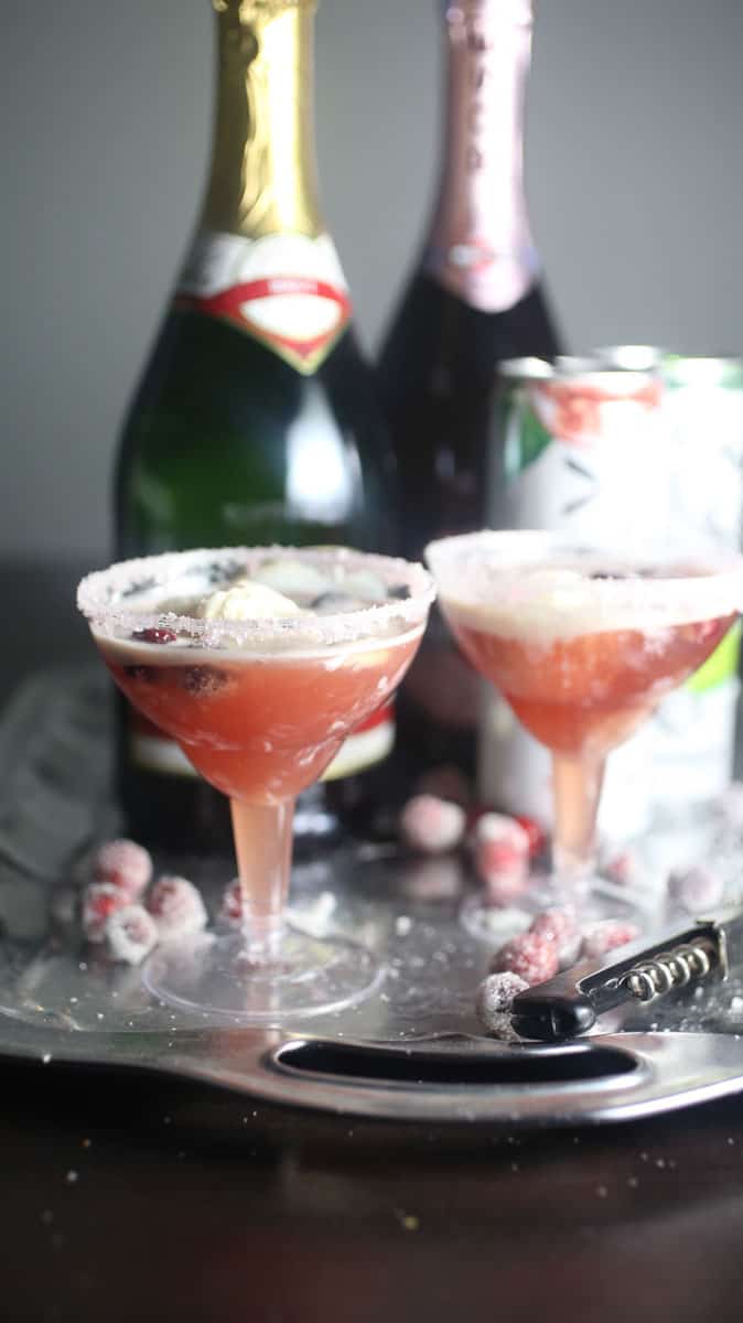 - Using a champagne glass, add some cranberry juice, add your choice of champagne, and top off with a scoop of ice cream and serve!