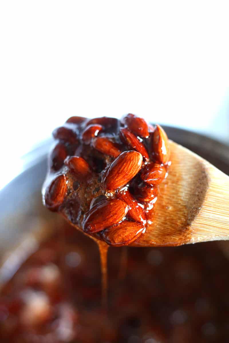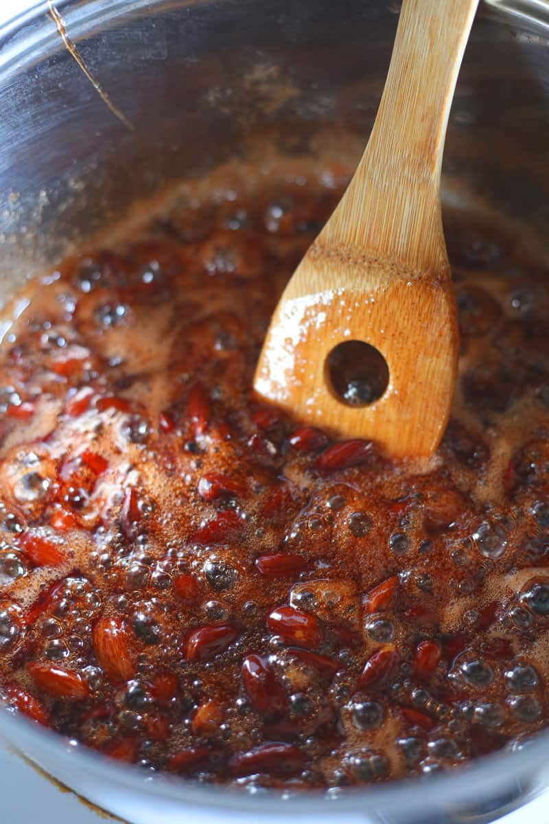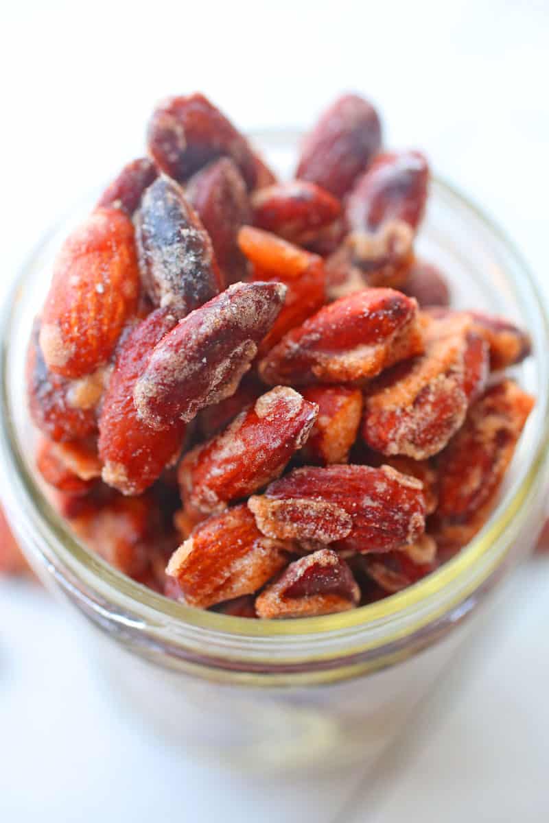 - In a medium sauce pan, add the water, bourbon, sugar, and cinnamon. Whisk together until well mixed. Bring to a slight boil by placing the heat on medium-high eat. Once the mixture has been brought to a slight boil, add the roasted almonds and stir until all is coated. Stir periodically. Allow the almonds to boil until most of the liquid has evaporated and the almonds are glossy and shiny about 15 minutes. If the almonds begin to appear as though there is a crusty coating on them, add about 2 tablespoons of water and stir and the almonds should go back to being glossy.