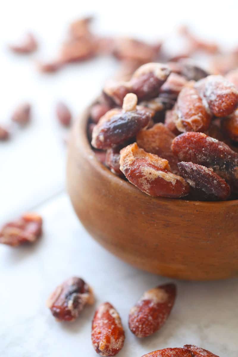 A healthy snack when you are trying to watch your figure is typically fruit, veggies, or some other weird superfood craze like seaweed. Typically, most healthy snacks taste healthy and aren’t even that great. Believe me, I have tried many of them. I have tried celery and peanut butter, peanut butter crackers, raw carrots and broccoli with hummus, and although these snacks are okay, they never really fulfill me. They only leave me more hungry and frustrated. This is even true for nuts. Although, I must admit, mixing nuts with cheese and dried fruit isn’t half bad. I am always looking for a healthy snack option to kill my cravings. I mean if I don’t, the next thing I will be snacking on is a large hot order of French Fries from McDonald’s. Yep, that’s how I get down. I know I can’t continue eating that way. At some point, I must eat like a decent human being and not a person who has no eating common sense. Although these Bourbon and Pumpkin Candied Almonds aren’t at the top of most healthy snacks list, they are at the top of mine.