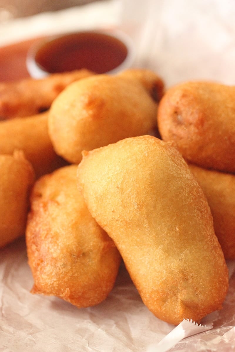 If there is one thing I love in the entire world is a good corn dog. The perfect corn dog for me is a beef hot dog on a stick, with a slightly sweet corn bread like coating, and fried to perfection with a slight crunch when bitten. OH and mustard. You must have mustard. That is the good stuff right there. I can eat corn dogs or corn dog bites all day every day. Sure they aren’t the healthiest thing in the world but they are one of the most beautiful things in the world to me. I often sit and think about how the creation of a corn dog must have come about. I don’t know why I feel that a serious genius had to come up with the corn dog because all it’s basically meat dipped into a stick and fried. America is known for coming up with stuff like that. Let’s see, what have I seen fried and dipped:
