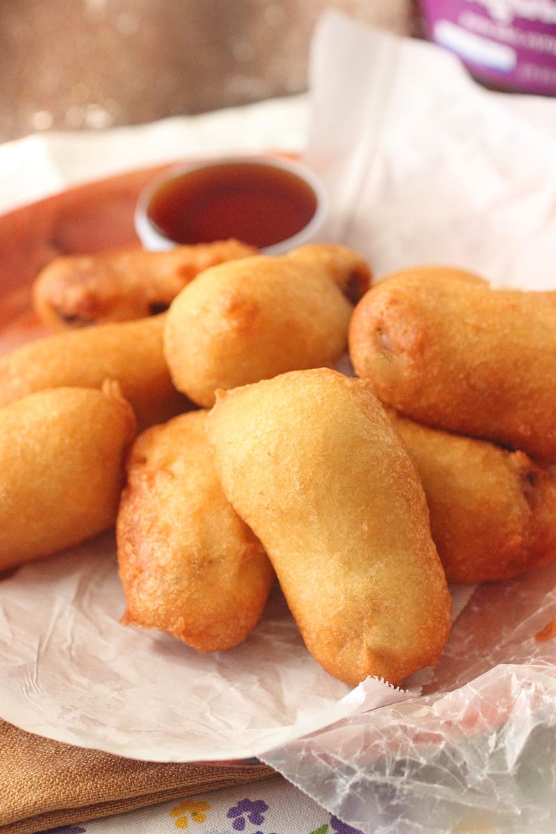 It is almost like we can’t help but to find ways to make something unhealthy even more unhealthy. Like the trans and saturated fat, high fructose corn syrup, and preservatives isn’t enough. You know what I am saying? But, I will not judge the people that come up with batter-fried stuff nor the people who enjoy them, because I love corn dogs. Loooove them! But, there is nothing worse than getting a corn dog and it isn’t good. The batter isn’t sweet and crisp and the hot dog is gross. That is the worse. However, the best thing about corn dogs is that it serves as inspiration to make other meat dipped things like these Breakfast Corn Dogs.