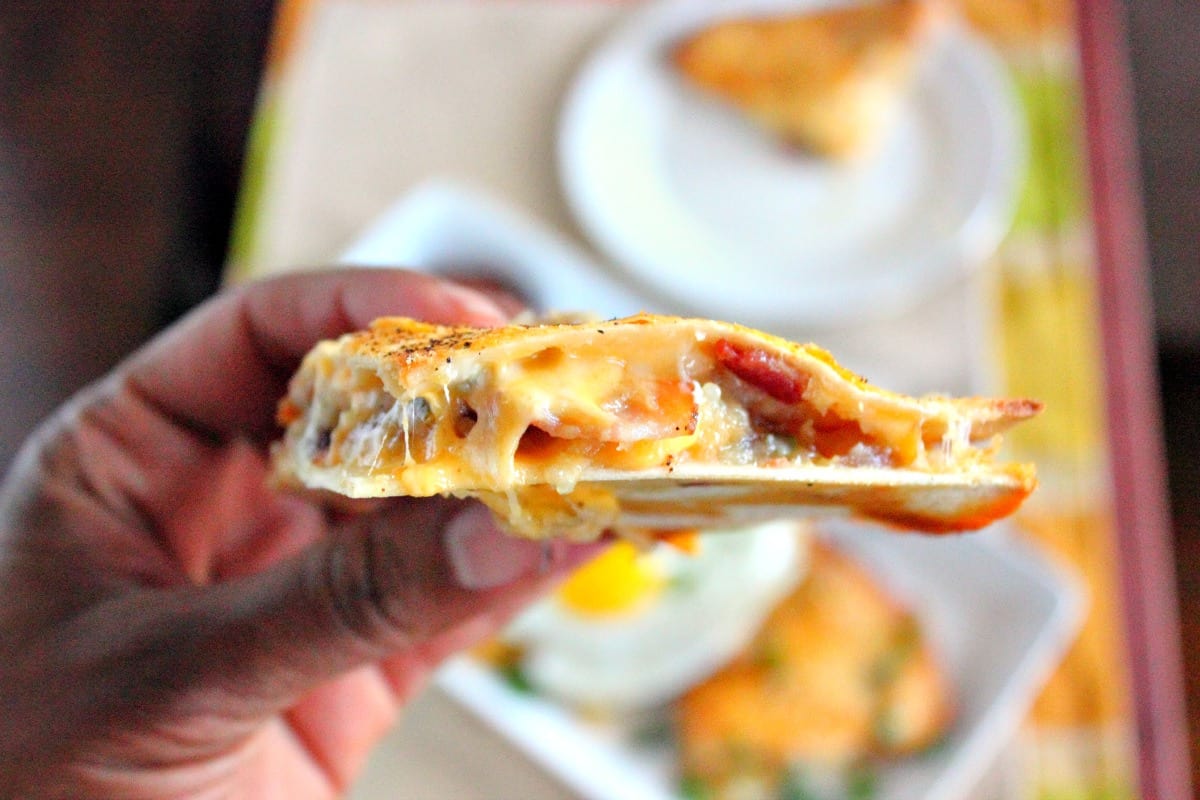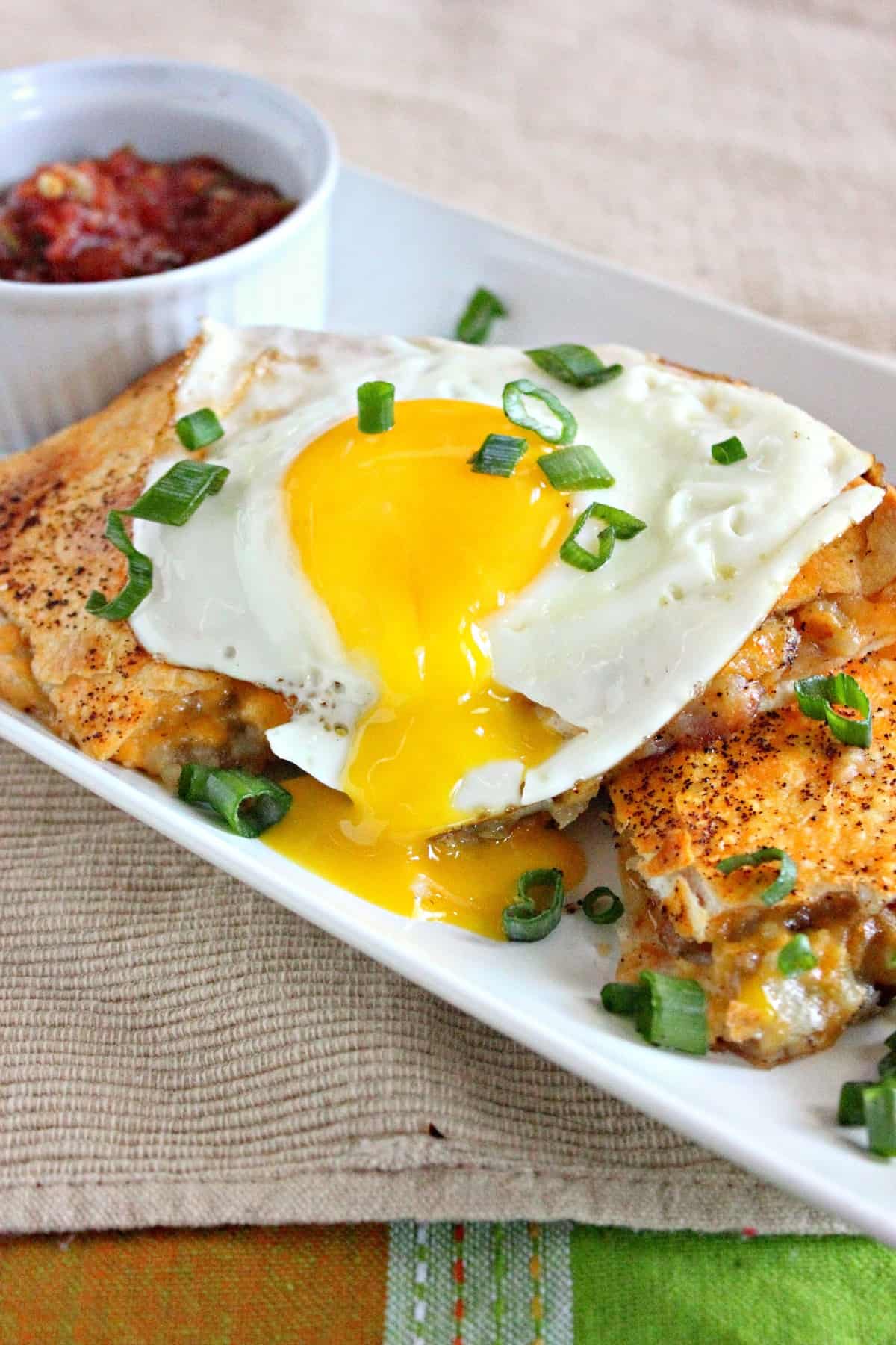 - Now that your quesadillas are done. Allow them to cool a bit before cutting them. Cut them into quarters, layer them on a nice looking plate, top off with some pico or salsa and lay on top the fried egg; garnish with chives if you would like. Enjoy with some sour cream if you want.