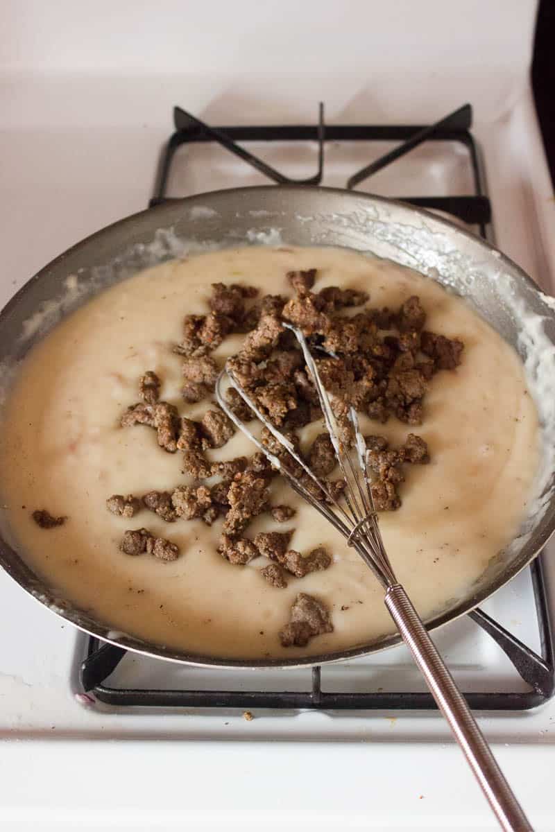 - In a large saute pan on medium heat, begin to cook your sausage. This shouldn’t take more than 10 minutes, but cook until completely cooked. Make sure you break up the big chunks of the sausage so every bite of the gravy will have some pieces of sausage.
