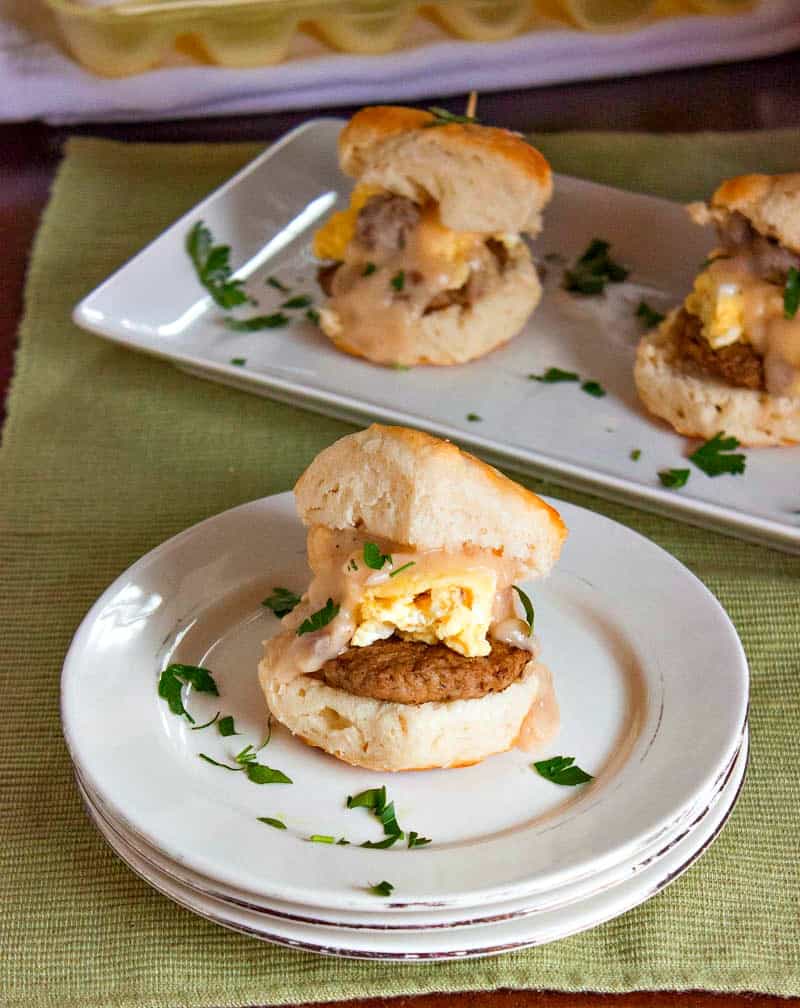 - Butter the tops of the biscuits, if you want, and slice them half way open. Place a sausage patty on the bottom of the biscuit, add a spoonful of scrambled eggs, and pour some of the breakfast gravy on top; garnish with chopped parsley if you want. Serve!