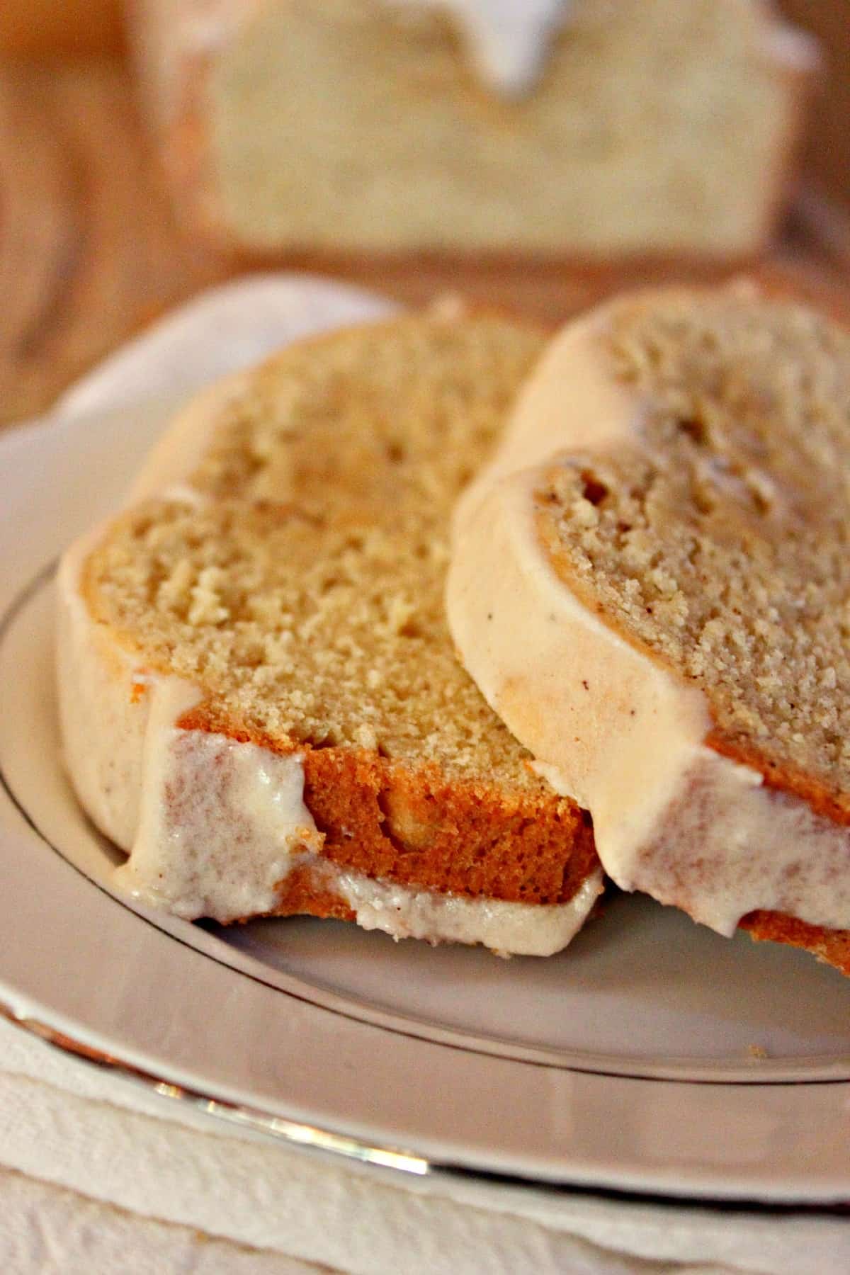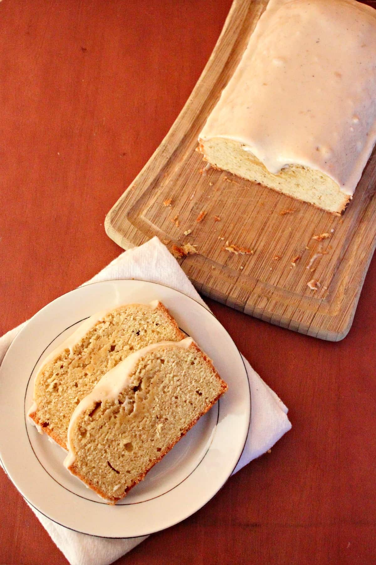 - Once the butter has congealed, blend together the butter, powdered sugar, salt, and vanilla extract. Blend in the tablespoon of milk one at a time. The consistency should be slightly thick but not as thick as frosting. Pour the glaze on top of the loaf and allow to set (30 minutes).