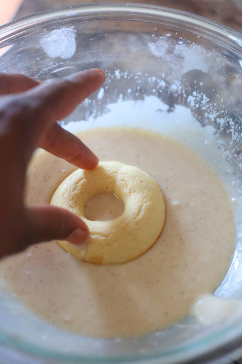 - Slowly combine the dry ingredients to the wet ingredients, while interchangeably adding the milk. The mix will begin to loosen and become smooth. Once the batter is mixed, pour into a piping bag and cut the end for an opening. Fill each part of the doughnut pan 2/3 rds with batter, place in the oven, and bake for 10-11 minutes. Allow to cool in the pan for a couple of minutes and then turn to the cooling rack.