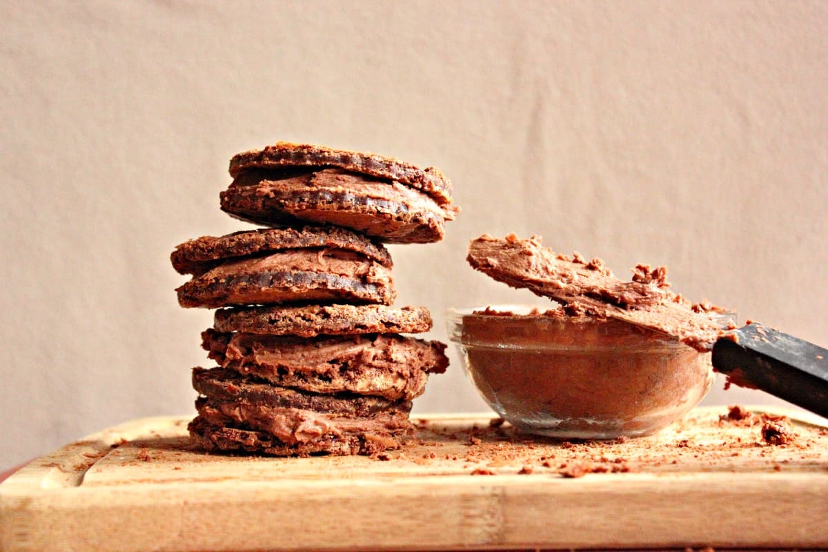 - For the filling: Beat the shortening and butter together in a large bowl. Add the powdered sugar and cocoa and beat them into the butter mixture. Add the vanilla extract and salt and mix to combine. Then mix in the heavy cream. Beat the mixture until it becomes a thick cream.