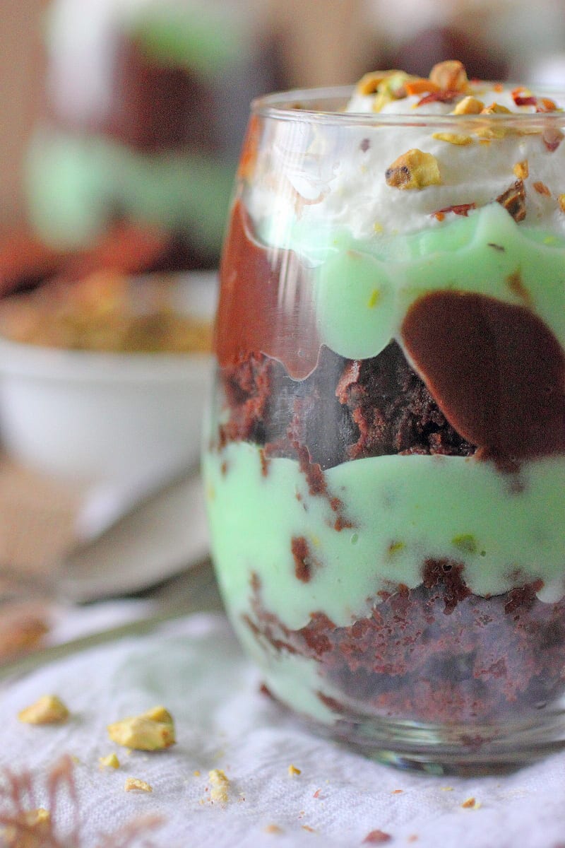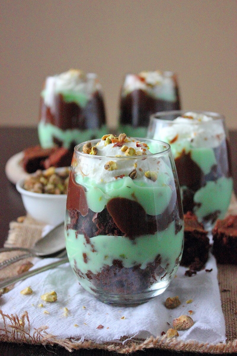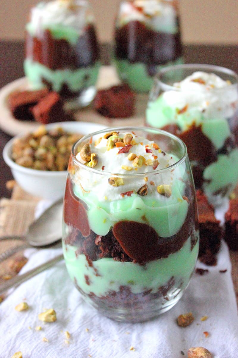 There is a small corner in the market that sells house-made gelato that is absolutely out of this world. I went there one summer and got a double scoop of gelato with Double Dutch Chocolate and Pistachio gelato on a house-made waffle cone and right at that moment I saw the angels dancing and the grey skies parted with a blue line. Chocolate and Pistachio is an AMAZING combination. It is a good combination in my Chocolate Covered Pistachio Shortbread Cookies and Chocolate Cake with Pistachio Buttercream Frosting. Now it is a good combination in these Brownie Trifles with Pistachio and Chocolate Pudding!