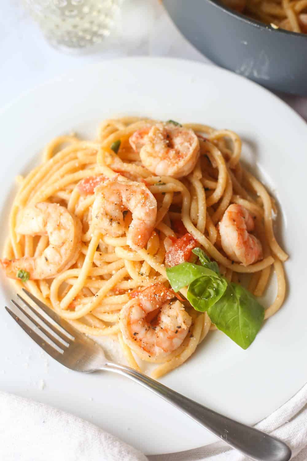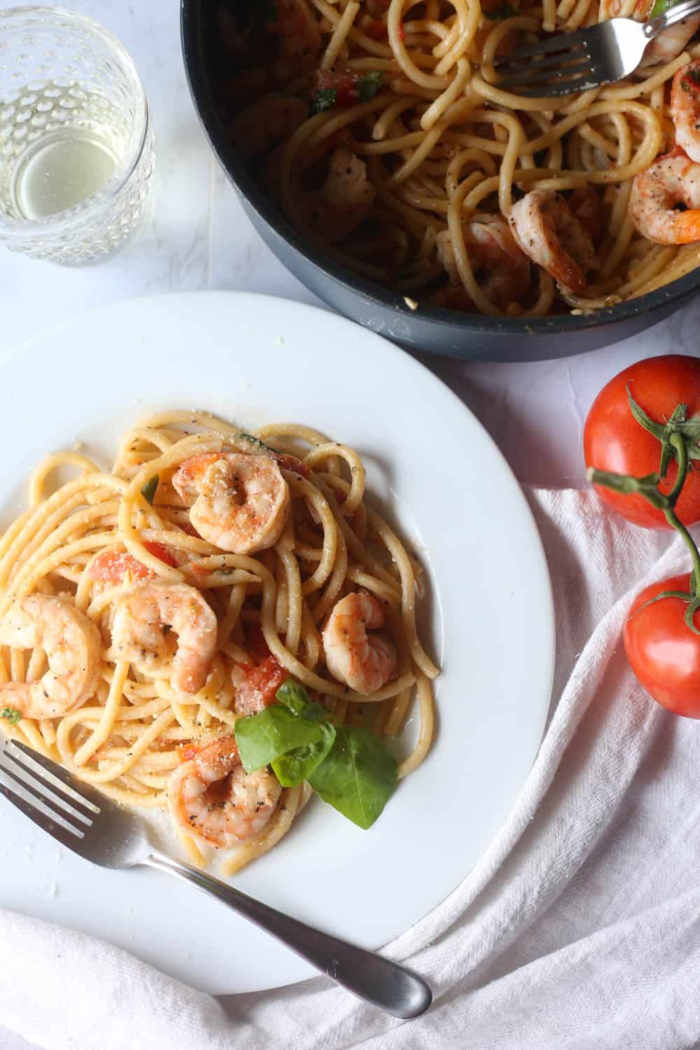 - Finally, add back in the shrimp, add the lemon juice, pasta water, and red wine vinegar, and give it a final toss. Season with salt and pepper to taste, and let the pasta simmer for 5-10 minutes. Serve with grated Parmesan Cheese, a little more fresh basil, and drizzle.