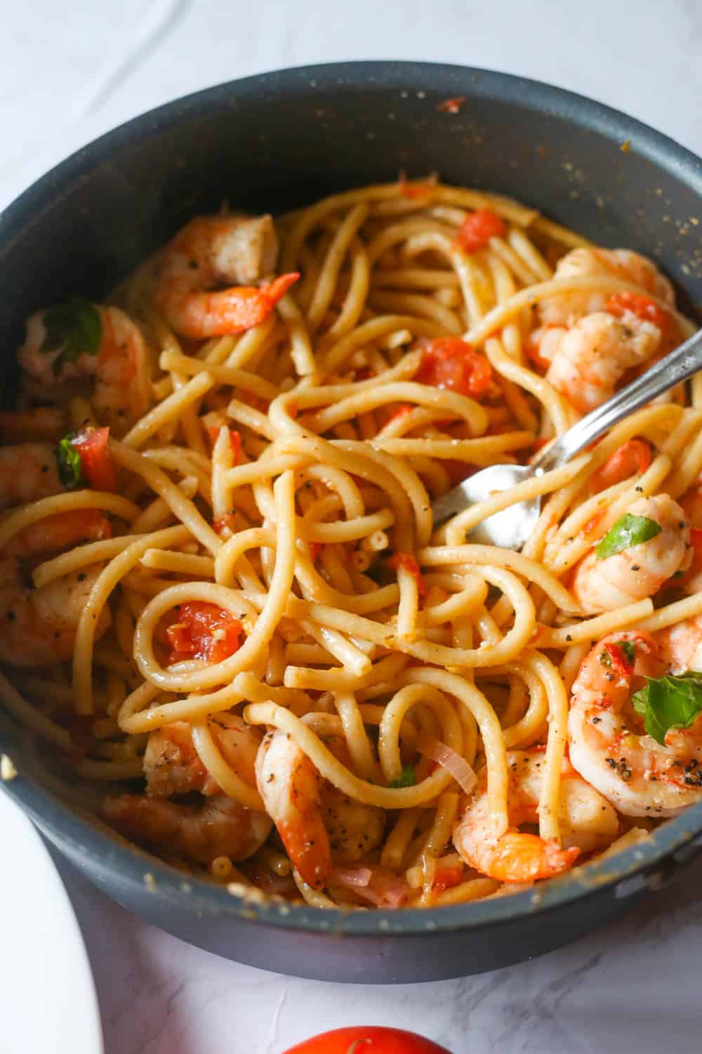 Traditionally Bruschetta is made with garlic, chopped fresh tomatoes, basil, and olive oil. It is then served on top of a grilled and crisp baguette. It is the perfect spring appetizer. It’s perfect for baby showers, bridal parties, and dinner parties. I’ve only been to a few places where they served the Bruschetta just right. Now, take that concept and transform it into a pasta dish in your mind and add shrimp!