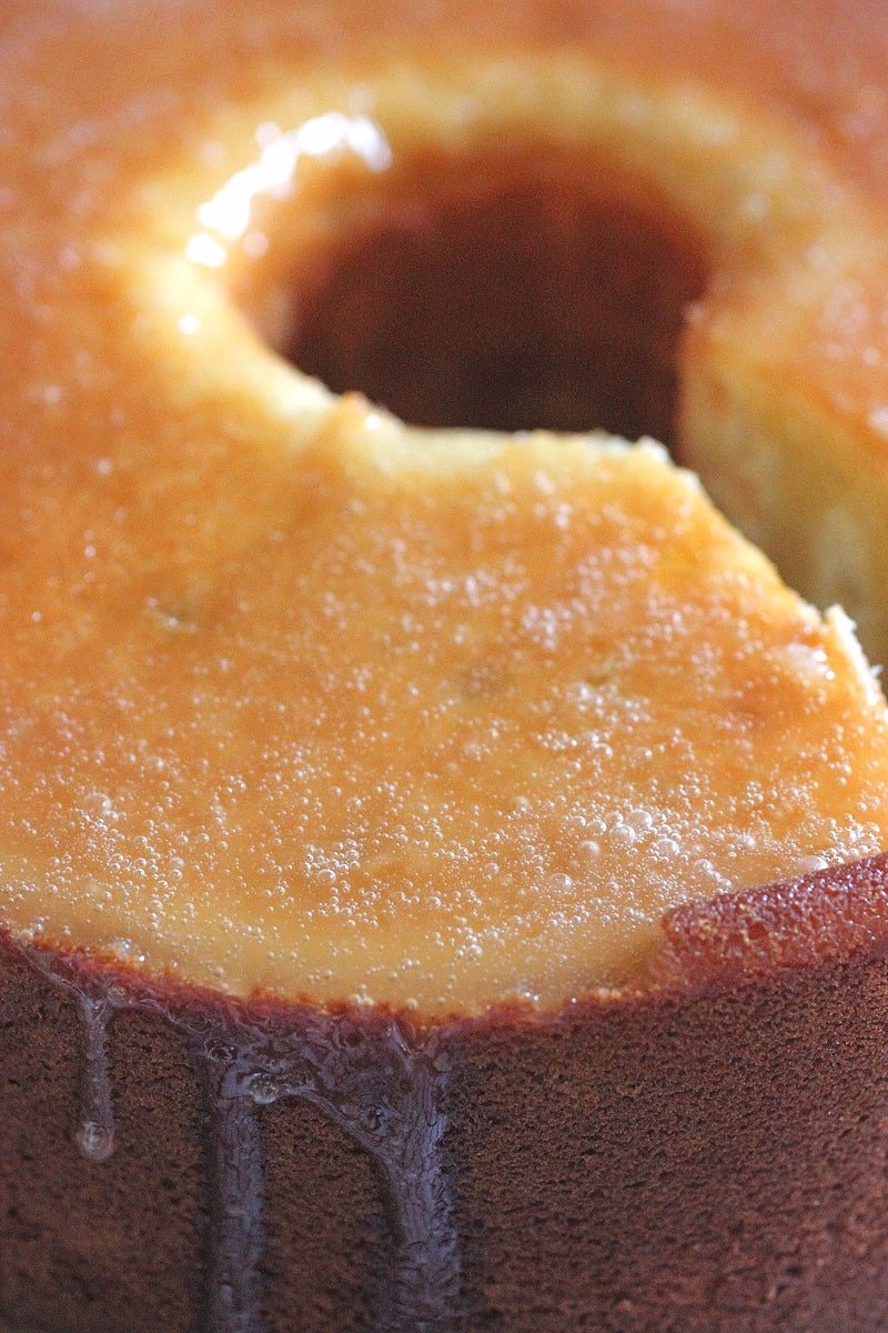 - In a small pot, melt the butter on low to medium heat. Add the sugar and corn syrup and bring to a slight simmer and stir for 5 minutes then remove from heat. Add the vanilla extract and pour the glaze on top of the cake. Once the cake has been completely cooled, garnish with powdered sugar.