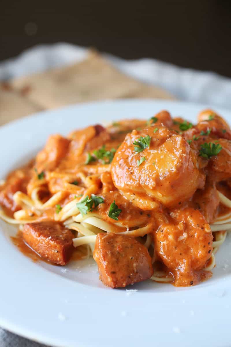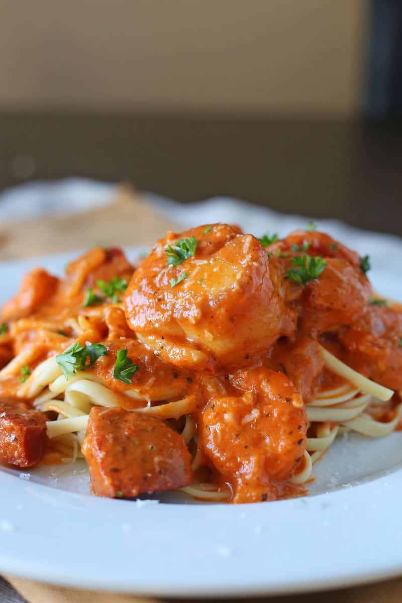 This Cajun Seafood Pasta is full of spicy sausage, shrimp, and plump sea scallops while served over linguine in a spicy tomato cream sauce!
