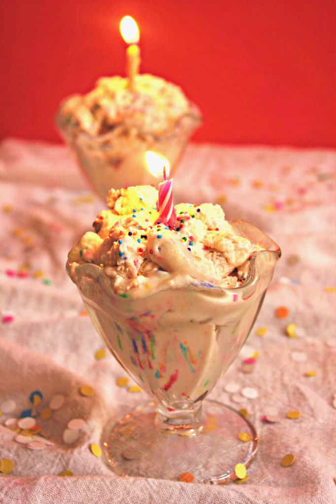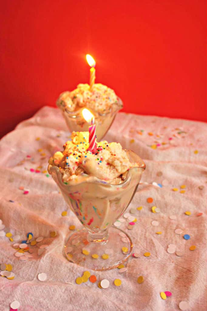 So let me tell you, I have never been a great fan of birthday cake ice cream, but birthday cake is my most favorite dessert. I mean white or yellow moist birthday cake with butter cream icing. Yum! Anyway, when I was told that it was a flavor and that I might like it. Initially I thought that it was a horrible idea and that birthday cake should only be in the form of a cake, not in ice cream. Well I had it for the first time a few years ago at a birthday party and I saw the doorways of heaven open and I saw the celestial choir sing “HA–LLELUJAH! HA–LLELUJAH! HALLELUJAH! HALLELUJAH! HALLE–LU–JUAH!”. You get the point. It was super good. So now that I know how to make homemade ice cream, I wanted to try to make it the same way but better. How about adding actual butter cream to it? I have to warn you, this ice cream is super sweet and you can’t leave the salt out because that will help level the sweetness a bit.