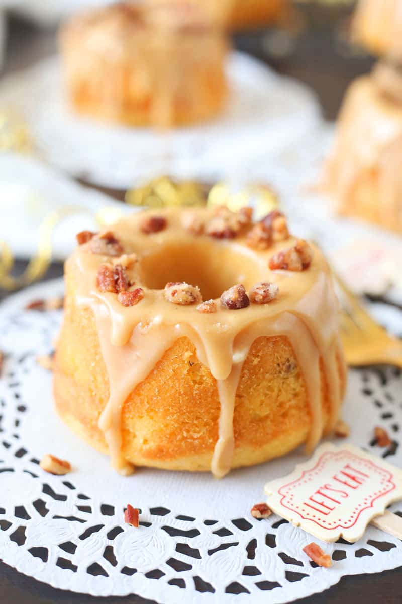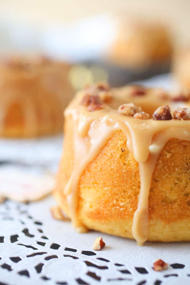 This Candied Pecan and Caramel Mini Cakes recipe are delicious and easy to make. Topped with an easy caramel glaze and buttery moist yellow cake.