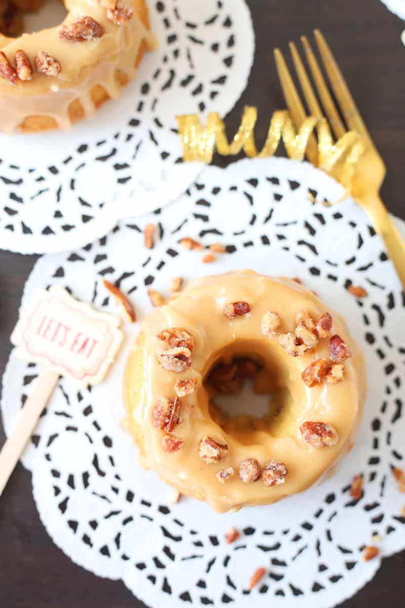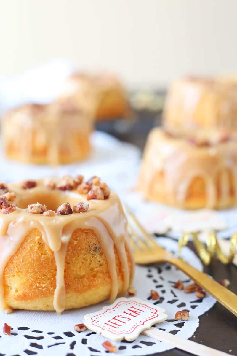 So I decided to take a box cake mix to cut a lot out a lot of steps and time, but add my own flare to the cakes. In fact, I just posted a recipe round up for Easy Dessert Recipes using Cake Mix last week that you can refer to if you are looking for something similar. I have tried a few of Jocelyn’s recipes myself and the one recipe of hers that I have made twice and absolutely-positively-love are the “Real Deal Caramel Cake”. You have got to try the recipe if you are looking for a caramel cake recipe. My Candied Pecan and Caramel Mini Cakes are like a distant cousin to her caramel cake recipe. They are perfect for the fall and for baby showers. If you are thinking of making this mini cake recipe you’re going to need the bundt cake pans and you can buy those here!