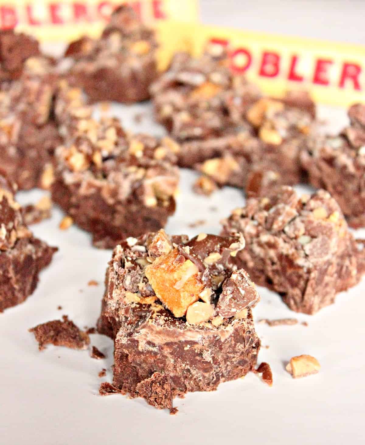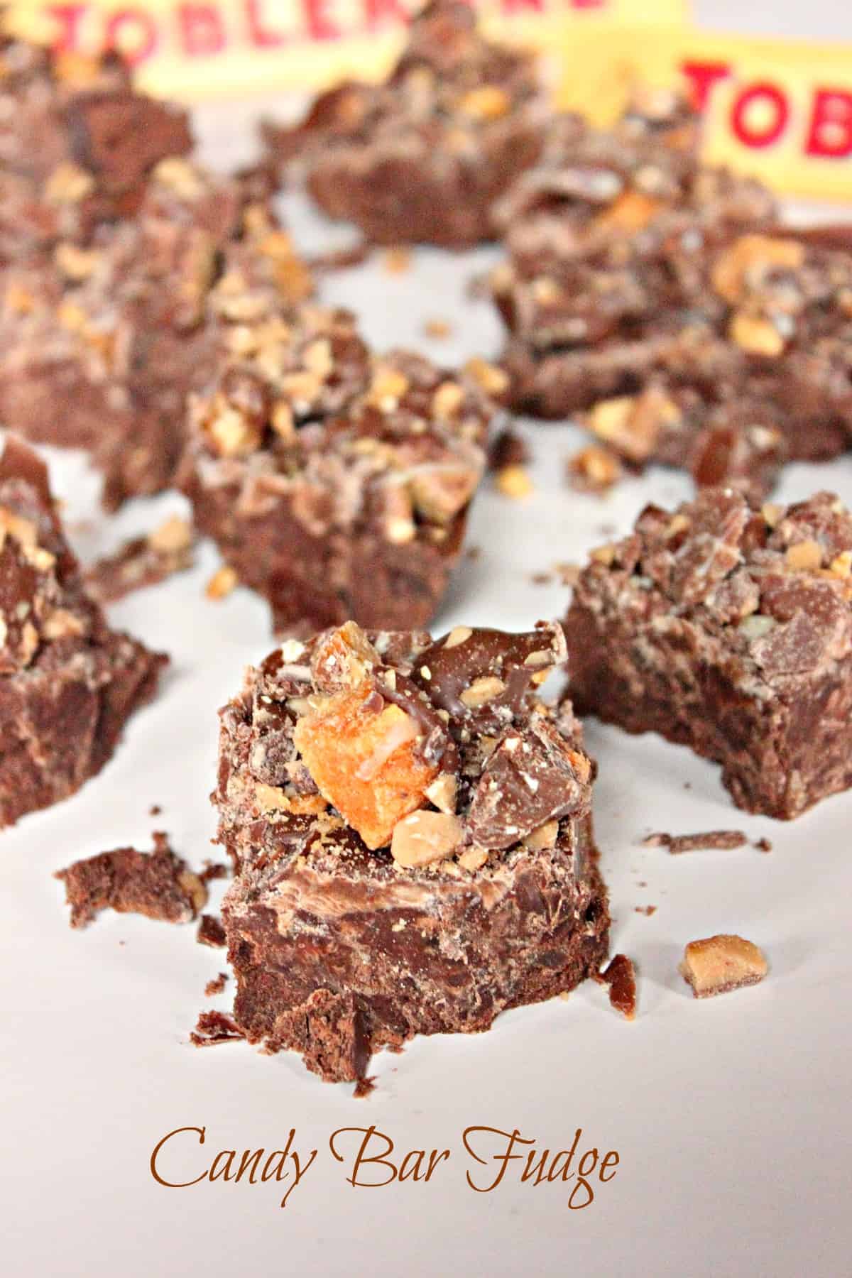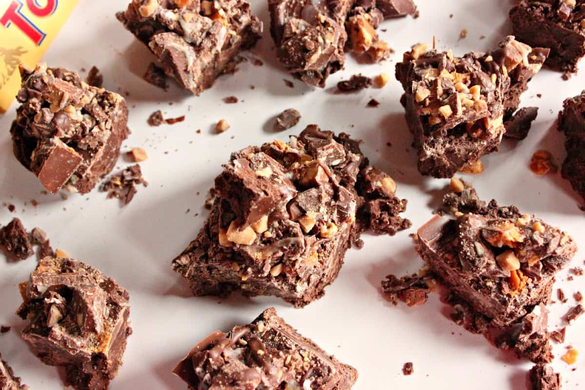 - While the fudge is firming, begin to chop all of chocolate candy bars (Toblerone and the minis) and set aside. You should have about 5 cups of chopped chocolate candy bars all together. Remove the fudge from the refrigerator. Melt 6 ounces of the milk chocolate in the microwave (make sure you stir it every 30 seconds). Once it’s smooth and melted, spread it on top of the fudge. Use the back of the spoon to spread it over the fudge. Immediately sprinkle the candy bar pieces on top and pat it into the chocolate (you may not need to use it all). Take some of the left over sweetened condensed that remains in the can and drizzle it on top as well. Allow it to sit for about 5 minutes. Then melt the other 6 ounces of chocolate in the microwave as instructed above. Drizzle that on top of the candy bar fudge and sprinkle the toffee pieces over that. Let it set for another 10-15 minutes.