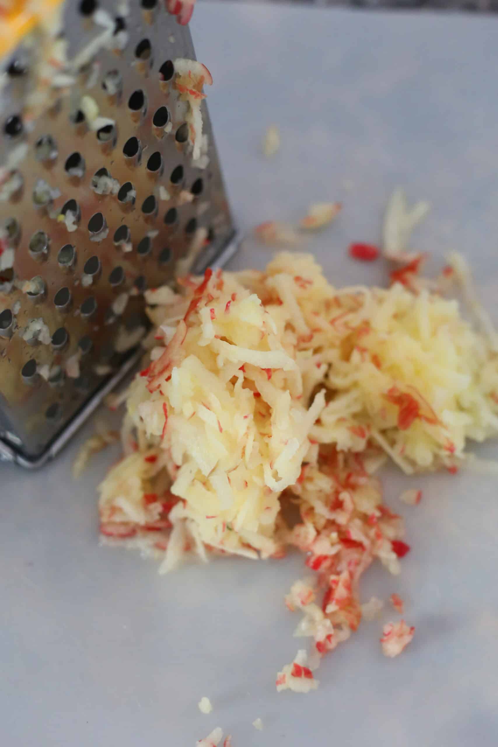 - Use the same method and grate two small Honeycrisp apples to the cord. Place the shredded apple in the middle of a clean kitchen towel or heavy-duty paper towel. Lightly squeeze the liquid just until it’s barely dripping liquid, not completely dry. Add the shredded apple and fold into the mixture.