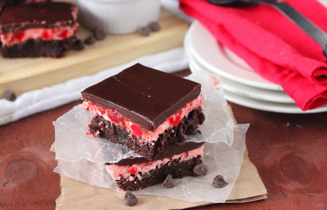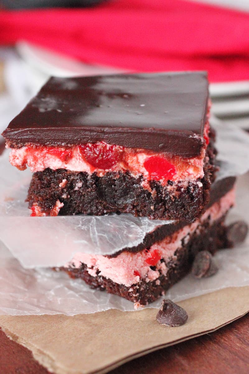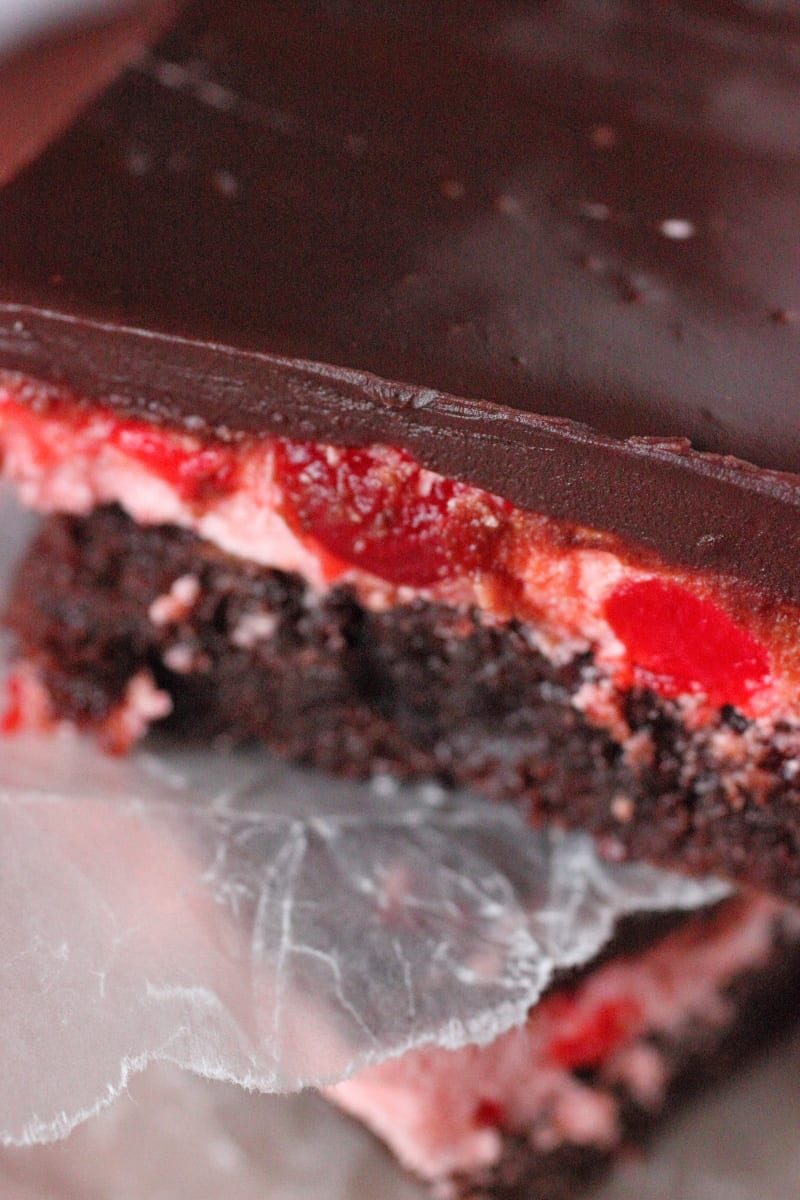 - To make the ganache, pour the chocolate chips in a bowl. Pour the heavy cream in a small sauce pan and bring to a boil. Pour the hot heavy cream on top of the chocolate chips and stir using spatula until smooth and creamy. Add the butter and stir until the butter has completely blended into the ganache. Allow the ganache to cool completely and pour on top of the cherry icing. Place in the refrigerator and allow the ganache to set. Cut into squares and serve.