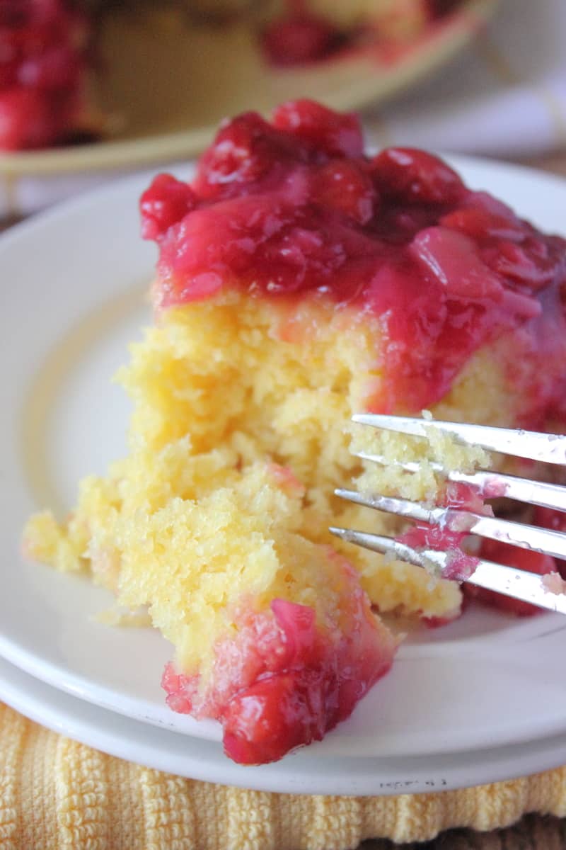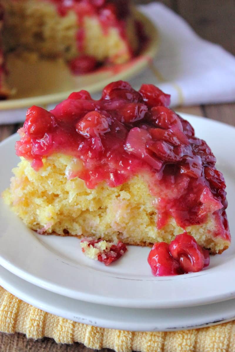 - Allow to cool for 10-15 minutes. Take a plate and place it on top of the pan and flip it upside down and the cake should come out smooth. Pour the rest of the cherry glaze on top of the cake and serve.