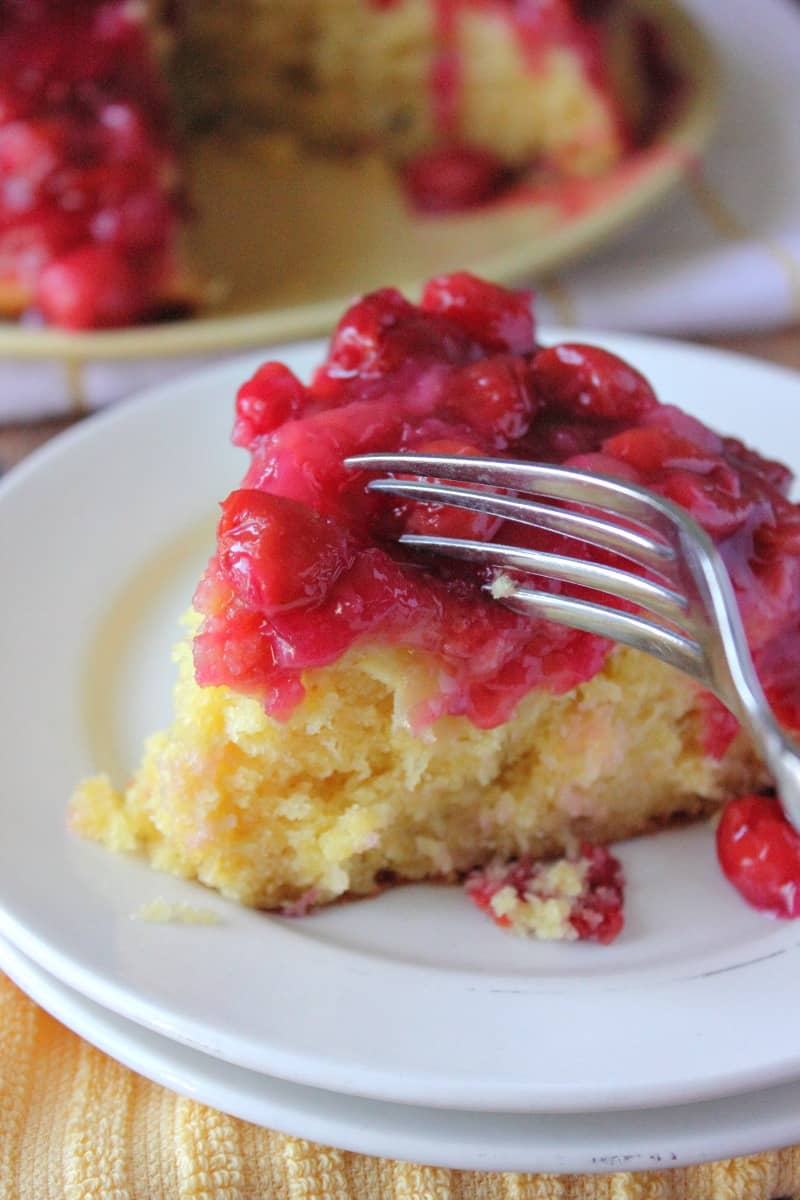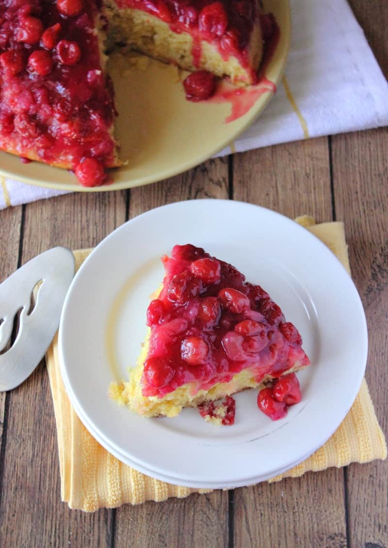 You ever had that experience where you found a bunch, of what seems to be, unlikely ingredients that actually works well together? I stumbled across a bag of frozen cherries that I was actually going to use for another purpose but as I stared at the bag for a while I remember something I had in college that a friend made that I absolutely fell in love with. It was a dump cake, if I am remembering correctly. It was kind of like this cake but backwards. She took a can of cherry filling and crushed pineapple and mixed it together and used yellow cake mix as a crumble that was crunchy, yet moist and buttery. To this day I still don’t know how she made the topping the way it was. So, I thought I take that same idea and flip it again making Cherry Pineapple Upside Down Cake. What do you think, huh?