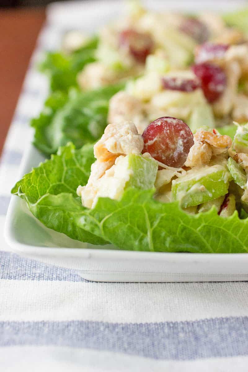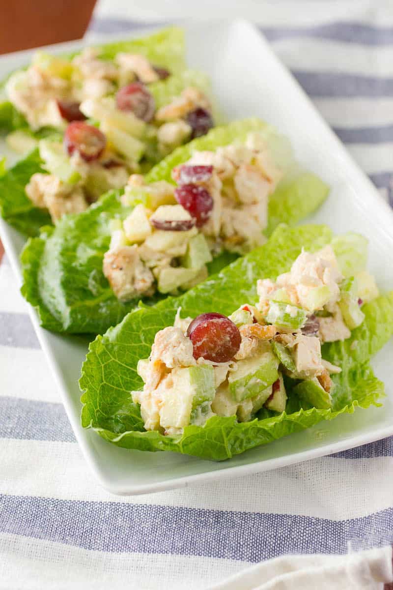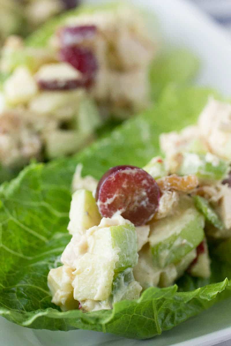 - Take whole Romain lettuce leaves and rinse them clean. Add about 2 tablespoons of the chicken and fruit salad into the inside of the Romain lettuce and enjoy!