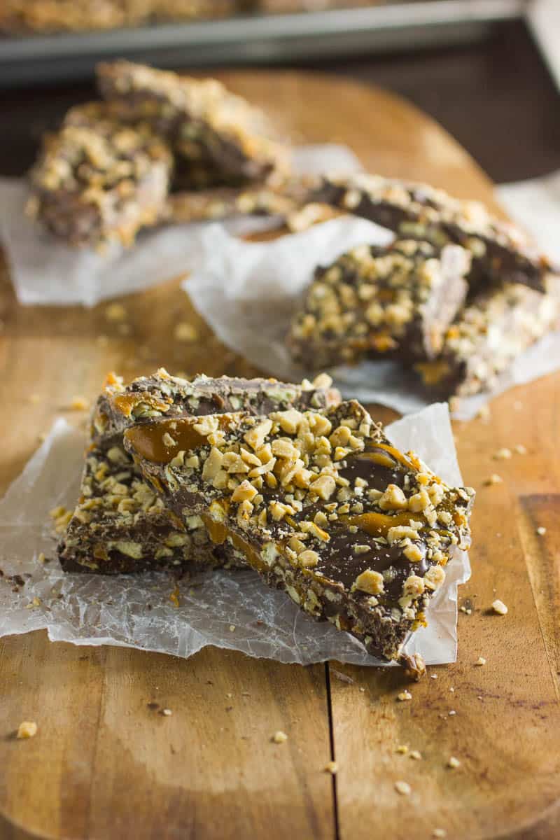 This Chocolate Bark is made with caramel, pecans, and salted pretzels. Everything you love on your chocolate to enjoy. Microwave only needed.