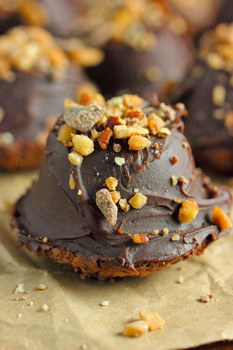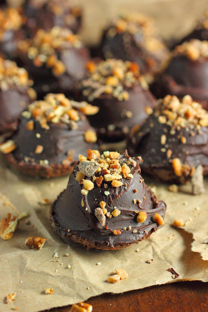 - Take each brownie bite and dip inside the chocolate glaze, face down, and turn to wax paper or a silicone sheet. Continue until all brownie bites have been dipped. Mix the pecans and toffee pieces in a small bowl. While wet, sprinkle the brownies with pecan and toffee bits mixture. Allow the chocolate to set before serving.