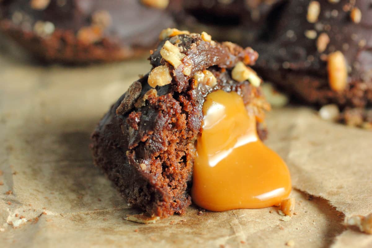 - In a large bowl, beat together the sugar and the eggs, adding eggs one at a time. Add the vanilla extract, flour, salt and chocolate sauce (should be at room temperature not hot). Then add the chocolate mixture and beat with a handheld mixer until well blended. Spray a mini muffin tin with baking spray. Use a cookie scooper and scoop the brownie batter into each muffin tin. Place a caramel chew in the middle of each muffin tin. Use a spoon to spoon the excess brownie batter over top the caramel chew. Bake for 12-15 minutes.