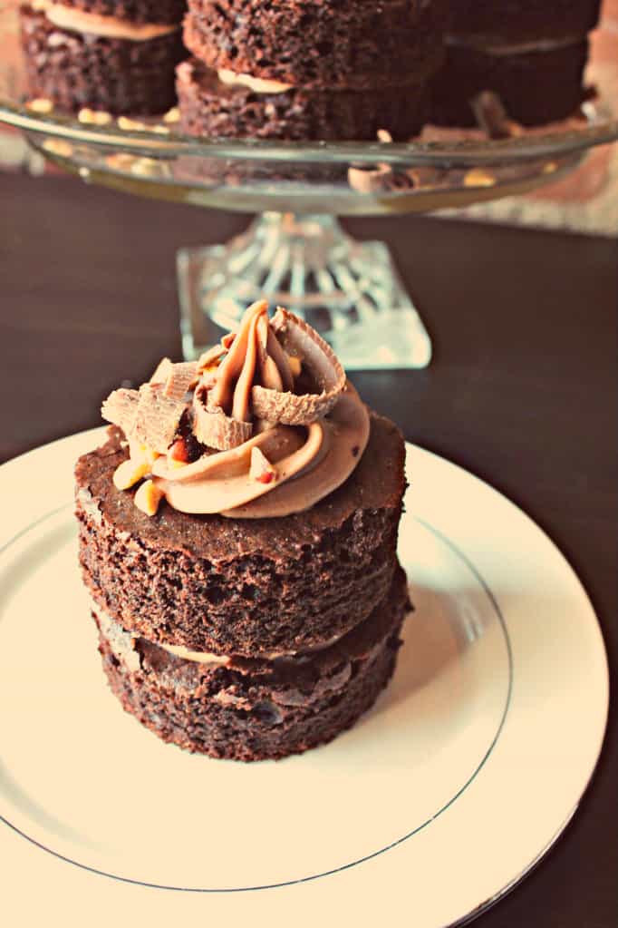 Therefore, I made a chocolate chiffon cake, Nutella buttercream frosting, and layered it like a mini two layered cake. I also topped it off with chocolate shavings and chopped hazelnut. Let me tell you, it is good! Also, because us cooks and bakers don’t waste anything, I took the left over chocolate cake and crumbled them into cupcake lining, add some frosting to it, and you go yourself some nice little samples there. Perhaps someone who doesn’t want to eat a full mini cake but a small portion of it. These cakes are great for dinner parties! Everyone will have their own dessert! How cute is that?!