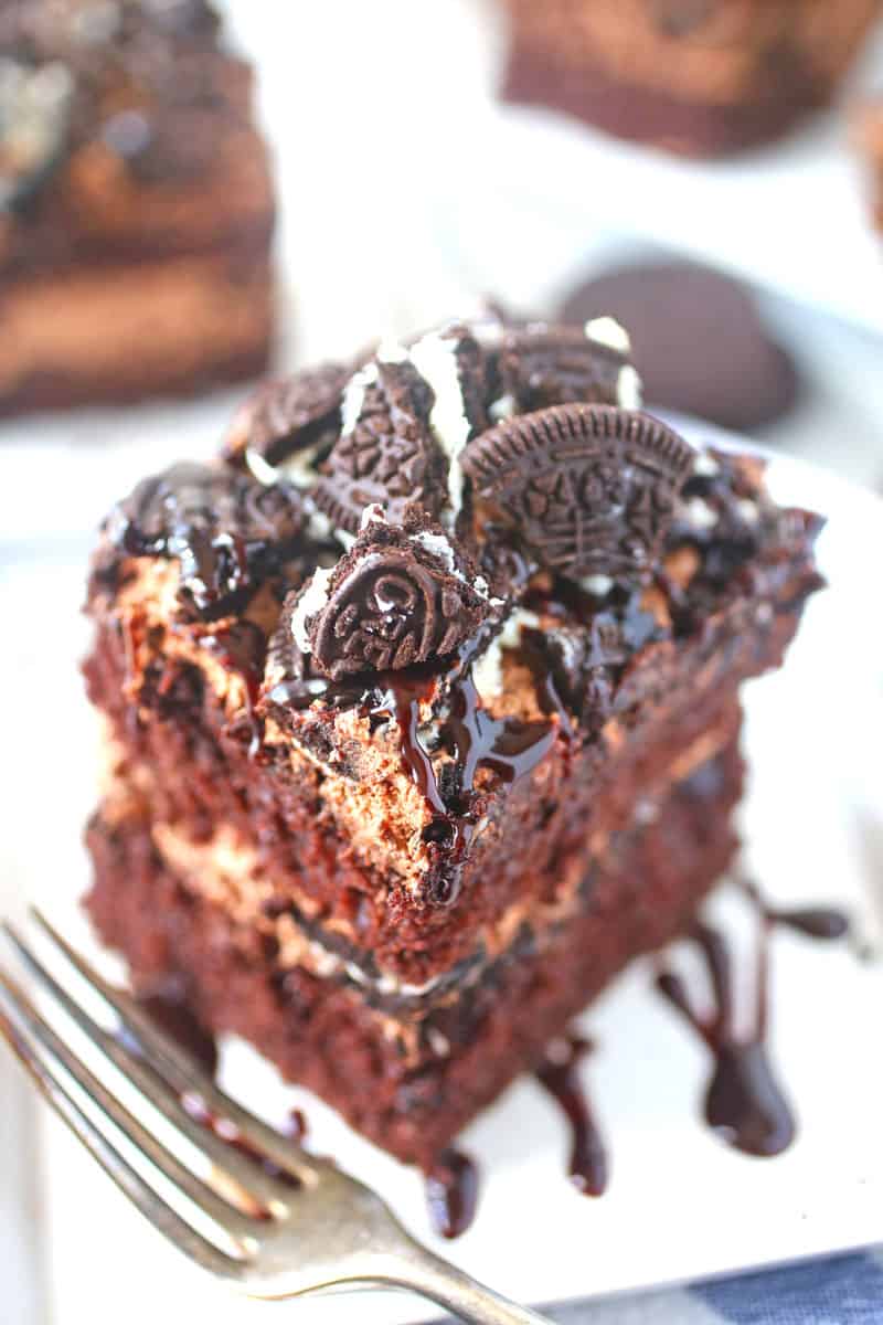 This Chocolate Oreo Cake Recipe is simple and perfect for the chocolate lovers. Its filled and topped with an easy chocolate mousse filling and chunks of Oreo cookie!
