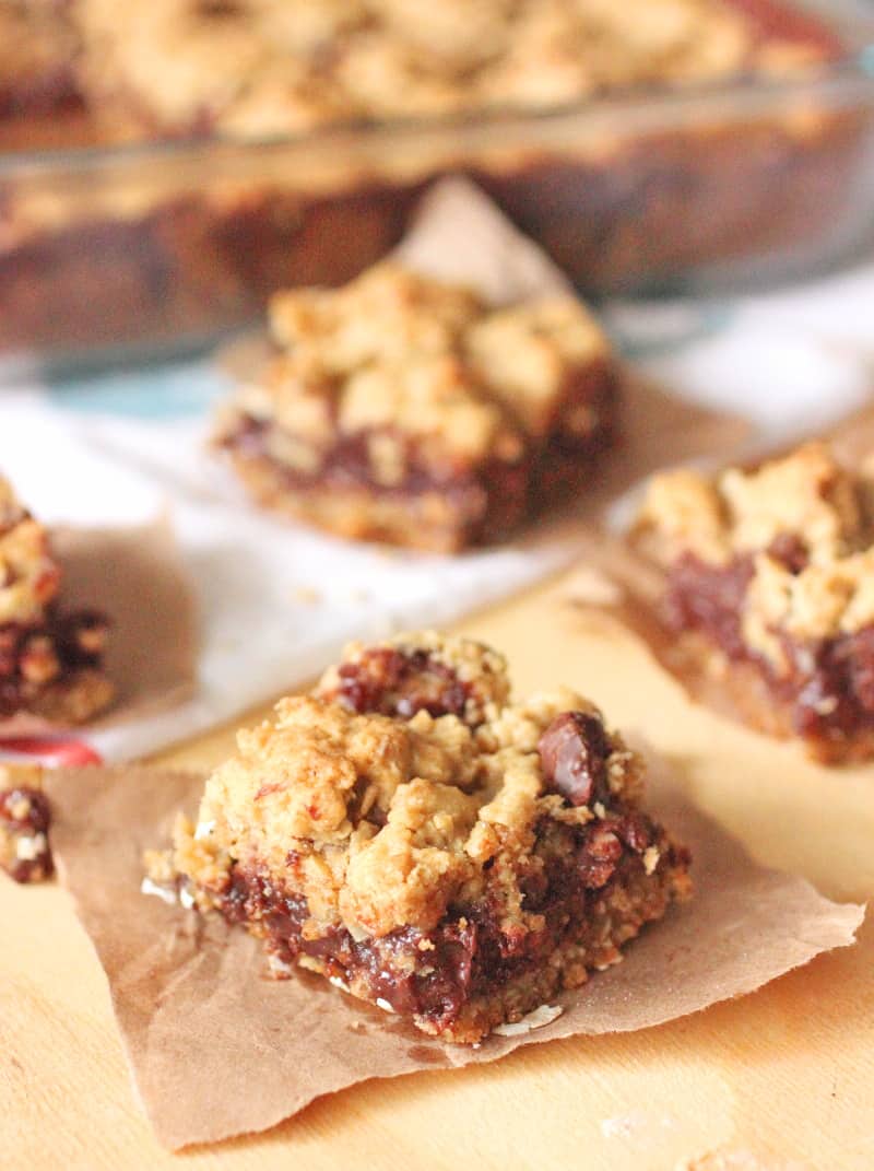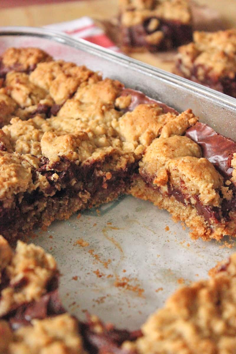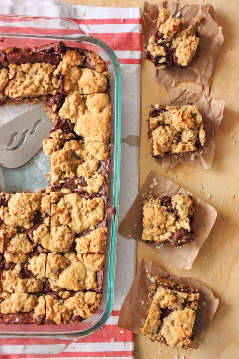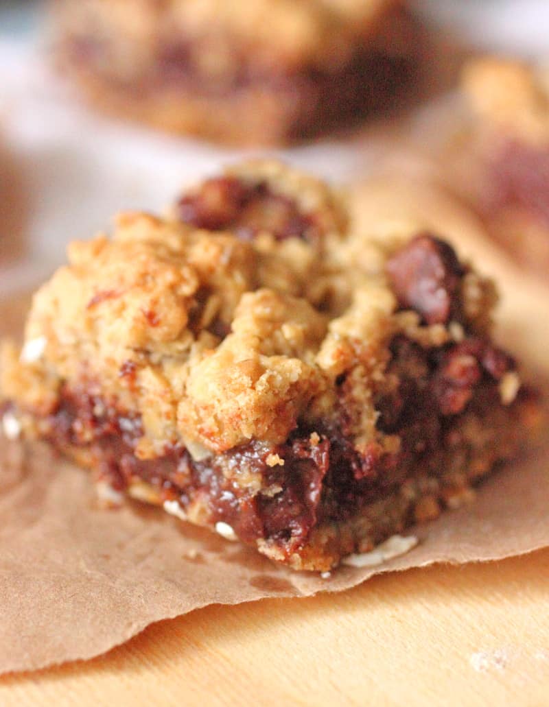- Press two-thirds (3 1/3 cups) of oat mixture onto the bottom of the 9X13 baking dish. Spread the filling over the oat mixture. Dot with the remaining oat mixture. Bake 25-30 minutes or until the top is light brown (filling will still look moist). Cool in pan on a wire rack. Cut into bars.