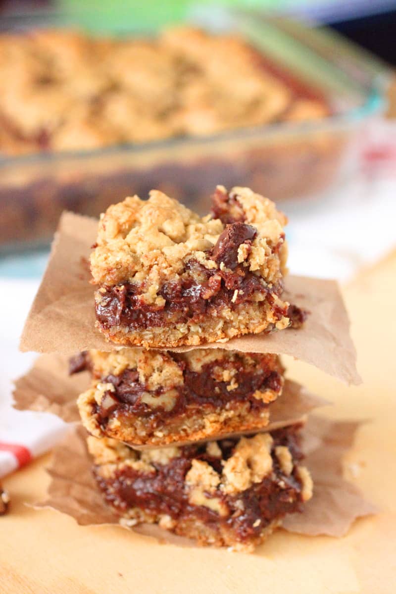 - To make the filling, melt the reserved 2 tablespoons of butter, add the chocolate chips, and sweetened condensed milk over low heat and stir until chocolate is melted. Remove from heat and stir in the nuts and 2 teaspoons of vanilla.