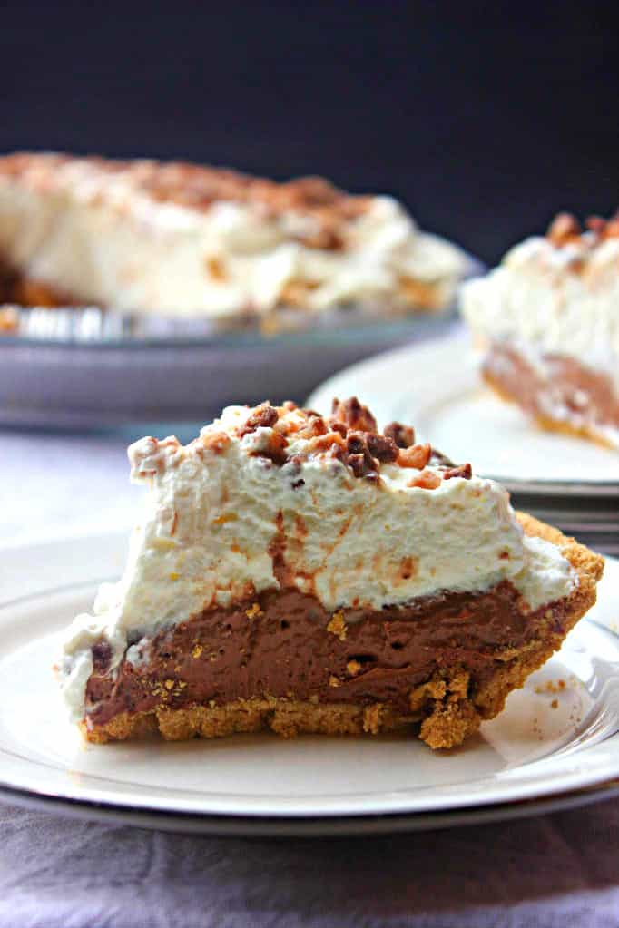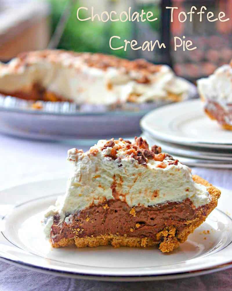 I know what you are thinking. You are thinking “Why did you make a Chocolate Cream Pie if you don’t like cream pies?” Here is the thing about cream pies, most of them are fluffy. I don’t like fluff. I don’t think Key Lime Pie is all that fluffy, but I am not a big fan of lime flavored stuff. Chocolate Cream Pie, at least the way I made it, is denser than most cream pies. The topping is important too. I topped this pie off with the Marscarpone Whipped Cream, the same whipped cream I used for my Toffee Brownies, and that too is denser and has a great light sweet cheese flavor. Also, in my chocolate cream pie I added some toffee pieces for some added texture and crunch. Not to mention this dessert is incredibly easy to make and it take almost no time. So if you have somewhere to go or if you want to make something quick this is the perfect dessert for your event!
