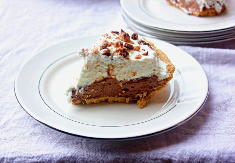 - In a medium-sized bowl beat the mascarpone cheese and sugar until creamy. Slowly add the heavy cream into the cheese mixture. Use a rubber spatula to scrape the sides of the bowl and continue to slowly add the cream until all is added. Beat until firm peaks are created. Scrape the whipped cream on top of the chocolate pie and top with additional toffee piece (optional). Place in the refrigerator for 1 hour to set.