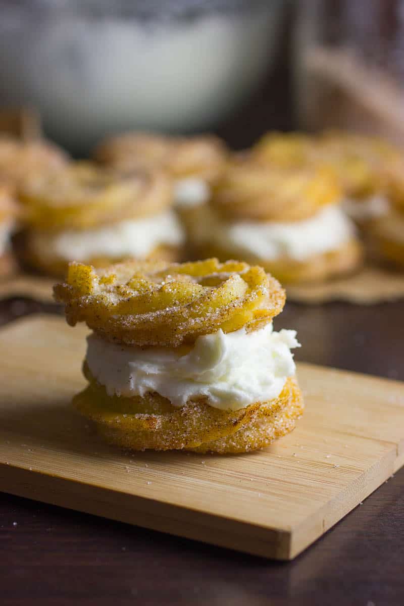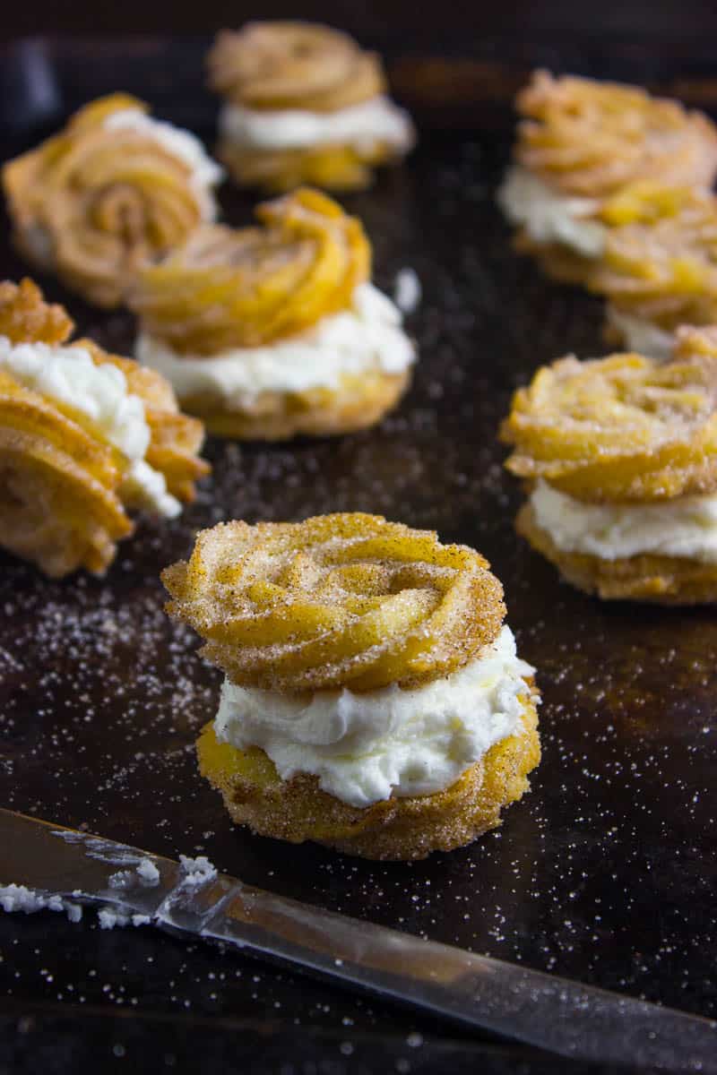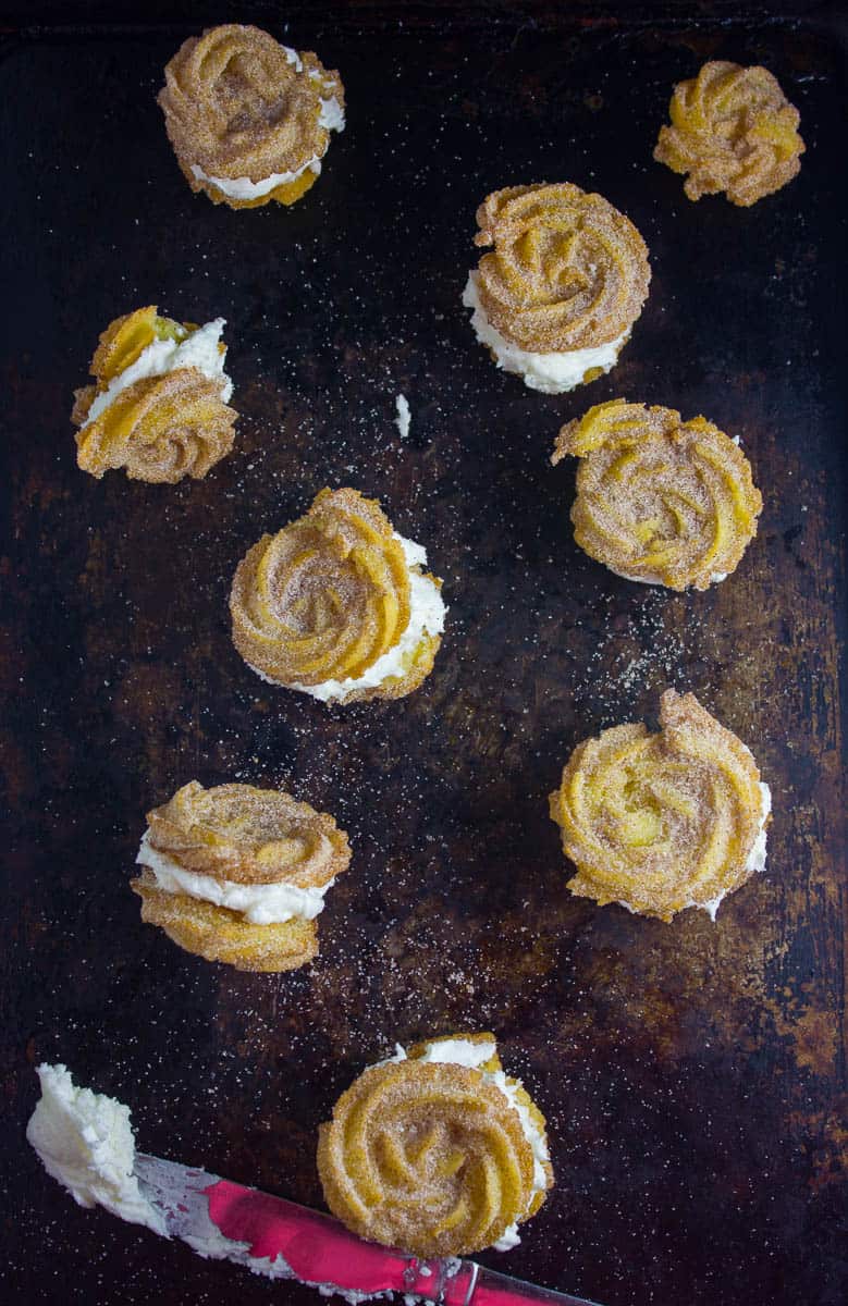I actually became inspired to make such a recipe from an Instagram photo I saw. I believe it was a Churro Sandwich with some sort of filling…or was it ice cream? I am not sure, but the picture looked so delicious that it made me want to make my own. I am absolutely in love with these Churro Whoopie Pies. Everything about this power combo works! The Churro Sandwich are soft in the middle and crisp on the outside. Just like an actual Churro! The Whoopie Pie filing is pretty basic but I added extra vanilla extract. I add extra vanilla extract to everything. It just makes everything taste better.