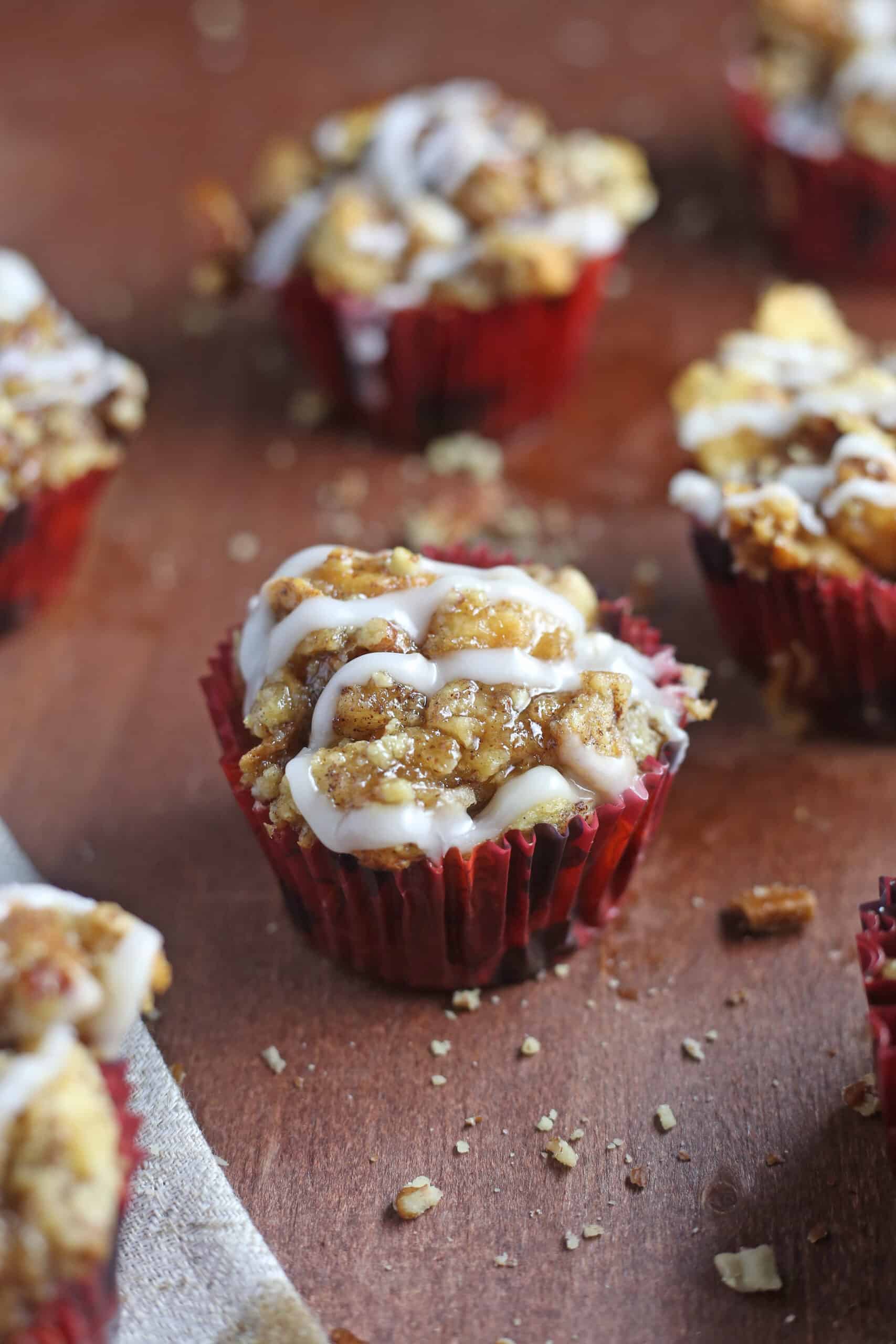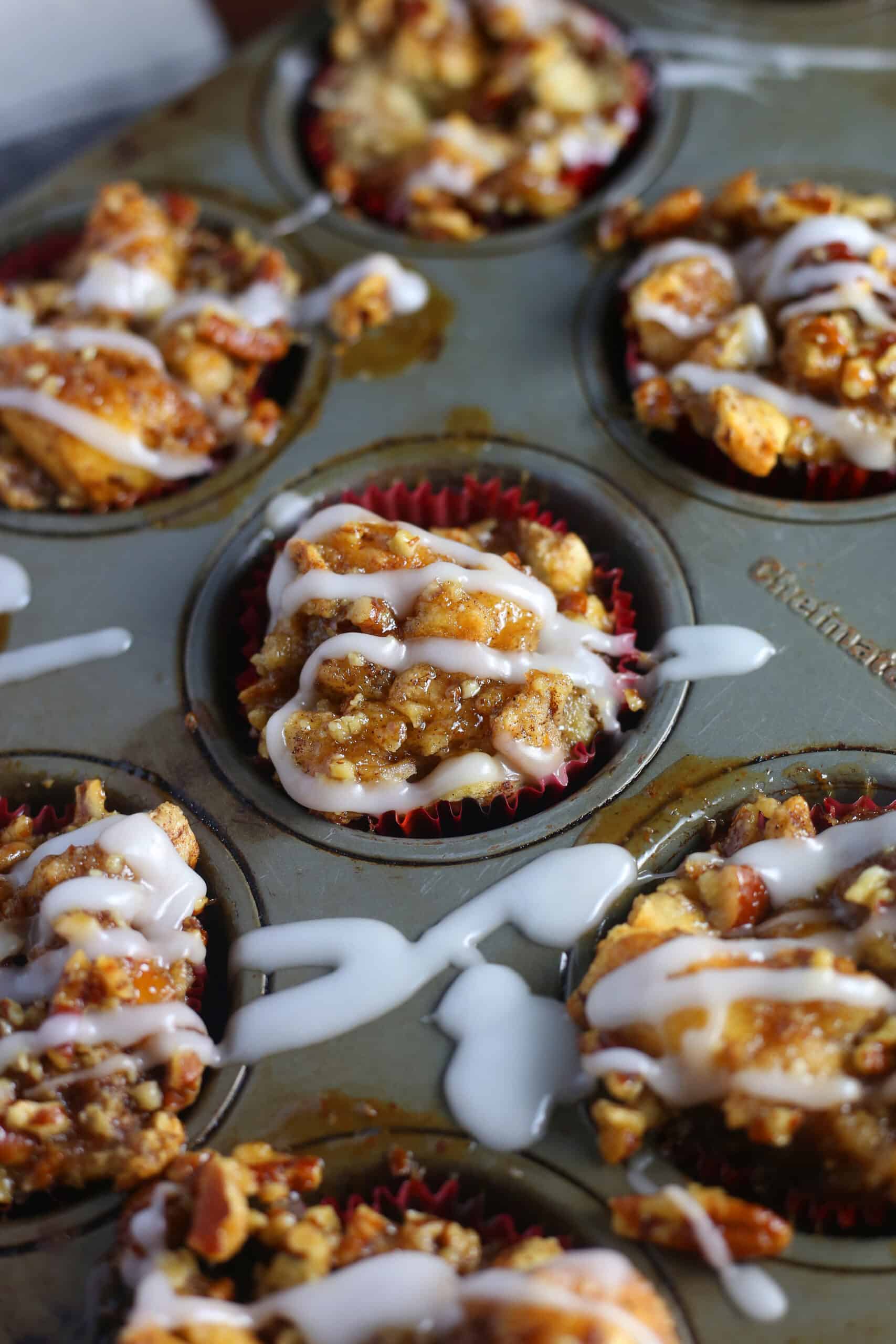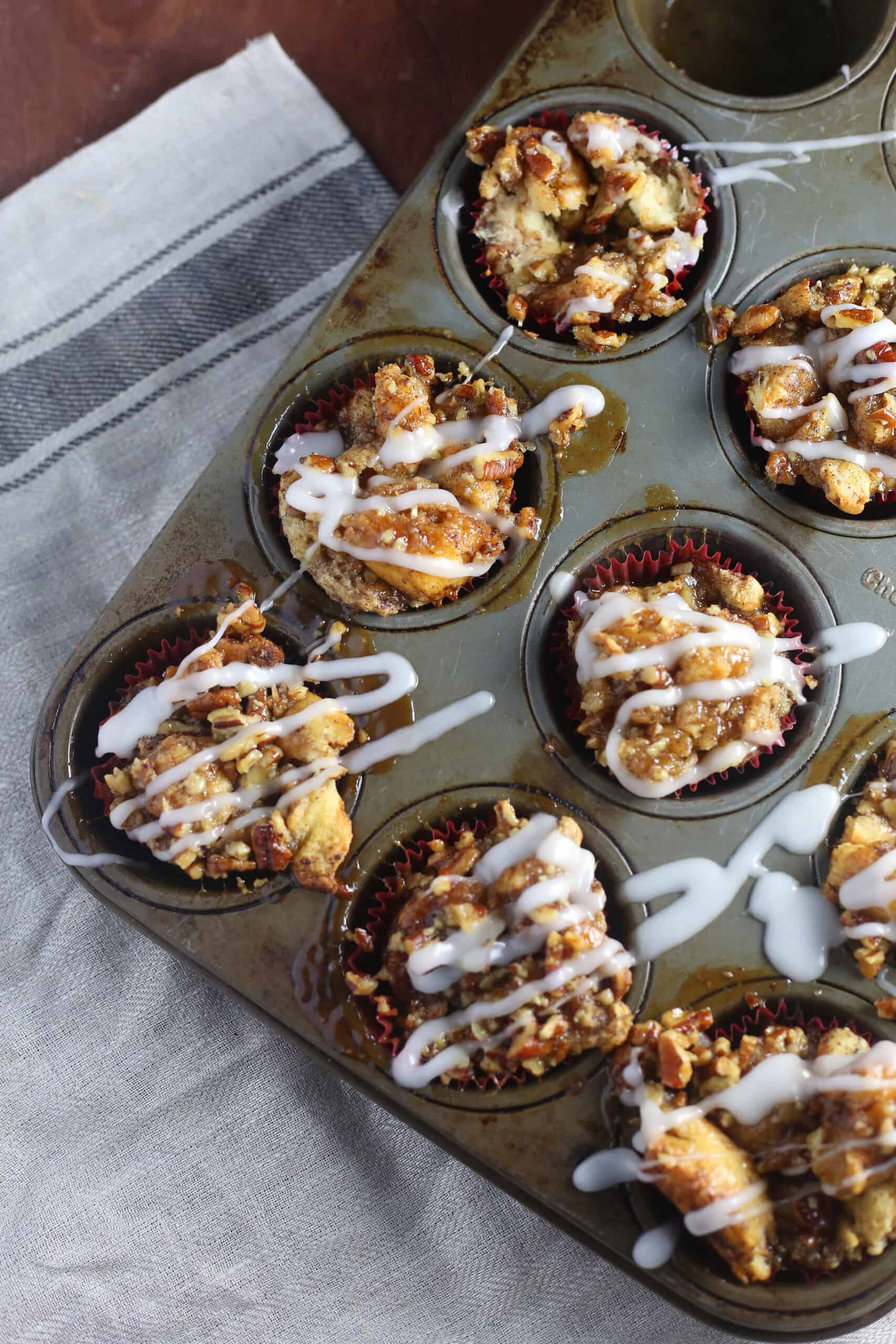 - Line a cupcake pan with liners. Use an ice cream scoop and scoop some of the bread pudding mixture into the liners. Spoon some of the caramel mixtures over the cinnamon roll mixture and bake for 20 minutes. Once finished allowing to cool slightly. About 5 minutes. Drizzle with the cinnamon roll glaze and serve.