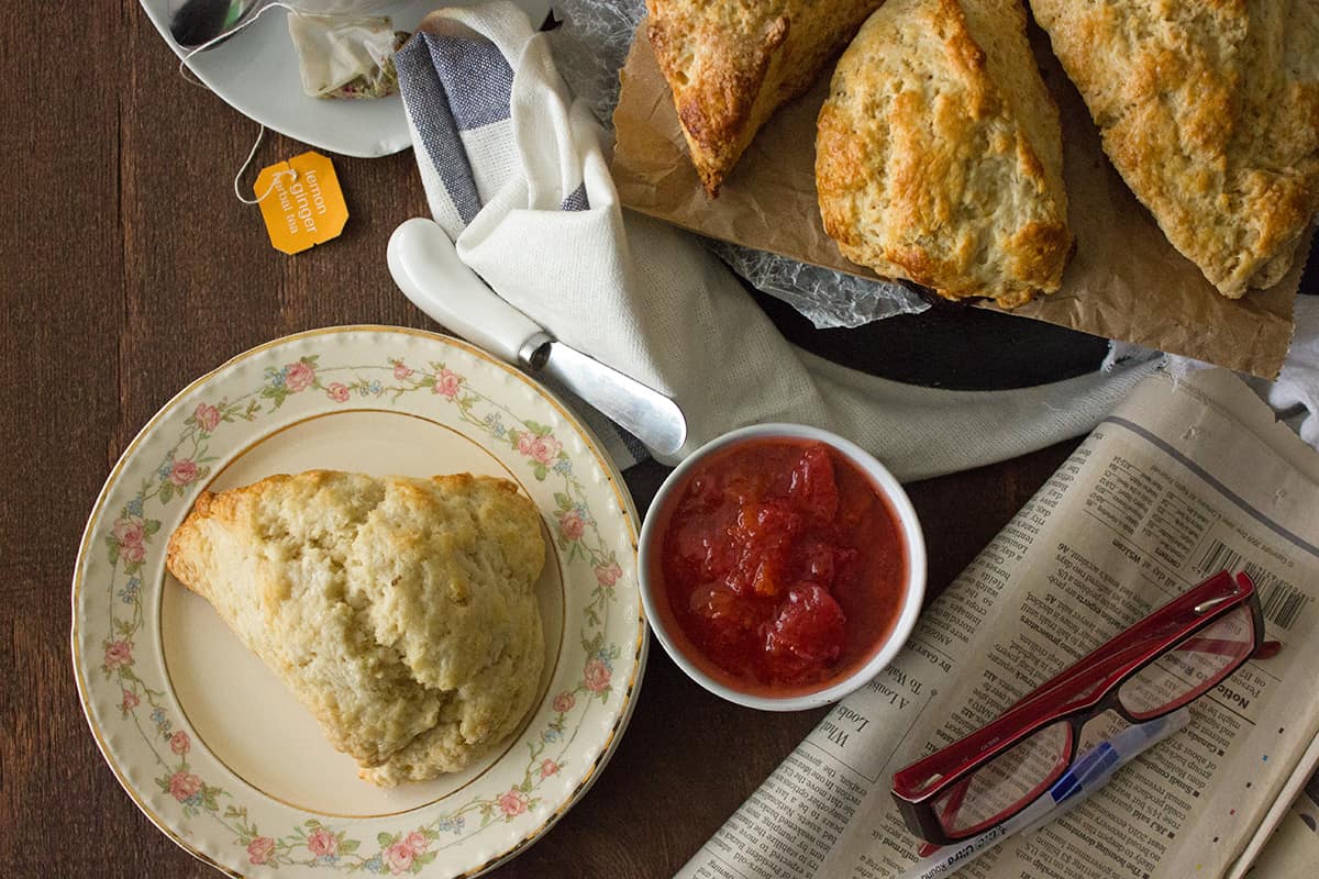 I imagine waking up in my beach out that is a lot like the beach house in the movie “Somethings Got To Give” with Jack Nicholson and Dianne Keaton, to the sound of soft ocean waves. I go to the kitchen, put on a pot of coffee for my husband. I boil water to make some tea and I sit outside on the porch, still in my pj’s, with my dog, Baby, and listening to jazz music. I’m up right around the time the sun has set and the morning dew is still fresh. The wear and tear of the day hasn’t taken over. I begin to enjoy the smell coming from the kitchen. It is the smell of sweetness, heaven, and grandma’s kitchen. I remove pillows of goodness from the oven and enjoy them on my porch with homemade strawberry and peach marmalade. Ahhh, life is awesome and amazing. Just thinking about this is A) Making me want to watch the movie B). Encouraging me to research the housing market of the Outer Banks and Lake Erie, and C) Making my mouth water for these Classic Buttermilk Scones.