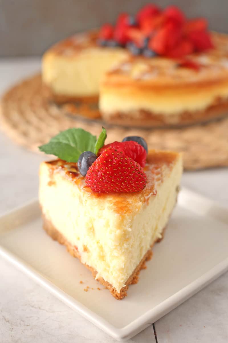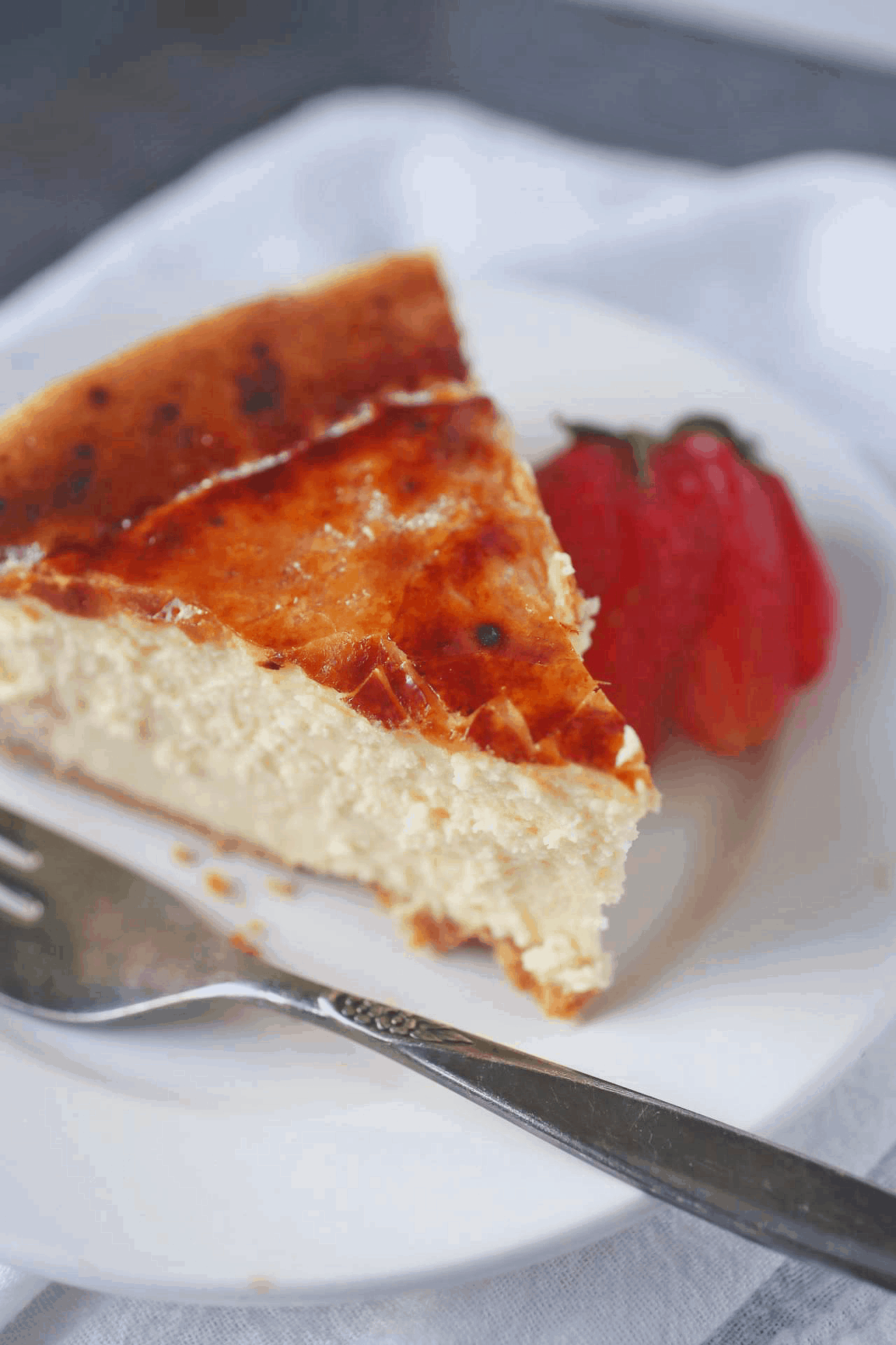 I will say, to my knowledge, there are no shortcuts to torching the top of the cake. You will need a culinary torch. They really aren’t that expensive. You can buy this culinary torch, which is fairly inexpensive. The great thing about torching the sugar, aside from the crunchy topping, is the caramelization of the sugar and its flavor. It takes on a whole new meaning. Serving this cheesecake alongside some fresh fruit and maybe a slight topping of whipped cream is the most perfect answer to a perfect meal.