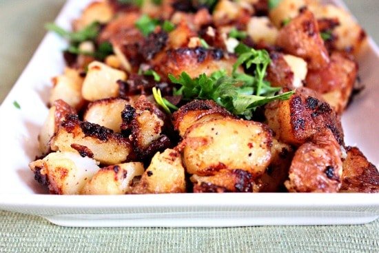 - Now that the potatoes are cooled, begin to dice them into cubes. Grab a large cast iron skillet, if you have it if not just use a large skillet, and turn on medium high heat. Add the duck fat into the pan and allow to get hot. Add the onions and cook in the duck fat for 5 minutes until they become translucent and then add the garlic. Add the potatoes to the pan and cook until golden brown on all sides, about 20 minutes and turn to a large plate or serving platter. Season with salt and pepper and add the flat leaf parsley to the dish and toss.
