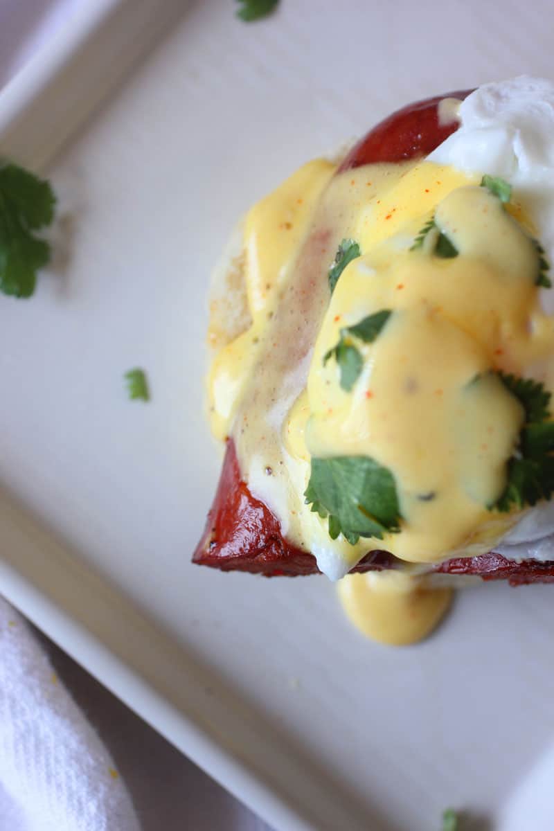 I started off making Homemade Buttermilk Biscuits. You can totally use your own recipe or buy store made biscuits if you want. Whatever is going to make your life easier is what you should do. Then, I made the hollandaise sauce using an immersion blender. You can totally use a regular blender but I just find that using the handheld immersion blender is more helpful for me. I added a little bit of cayenne pepper to the hollandaise sauce to give it some kick. Finally, I fried some spicy sausage by Evergood Fine Goods, which is based out of San Francisco as they have some of the best sausages in the country!