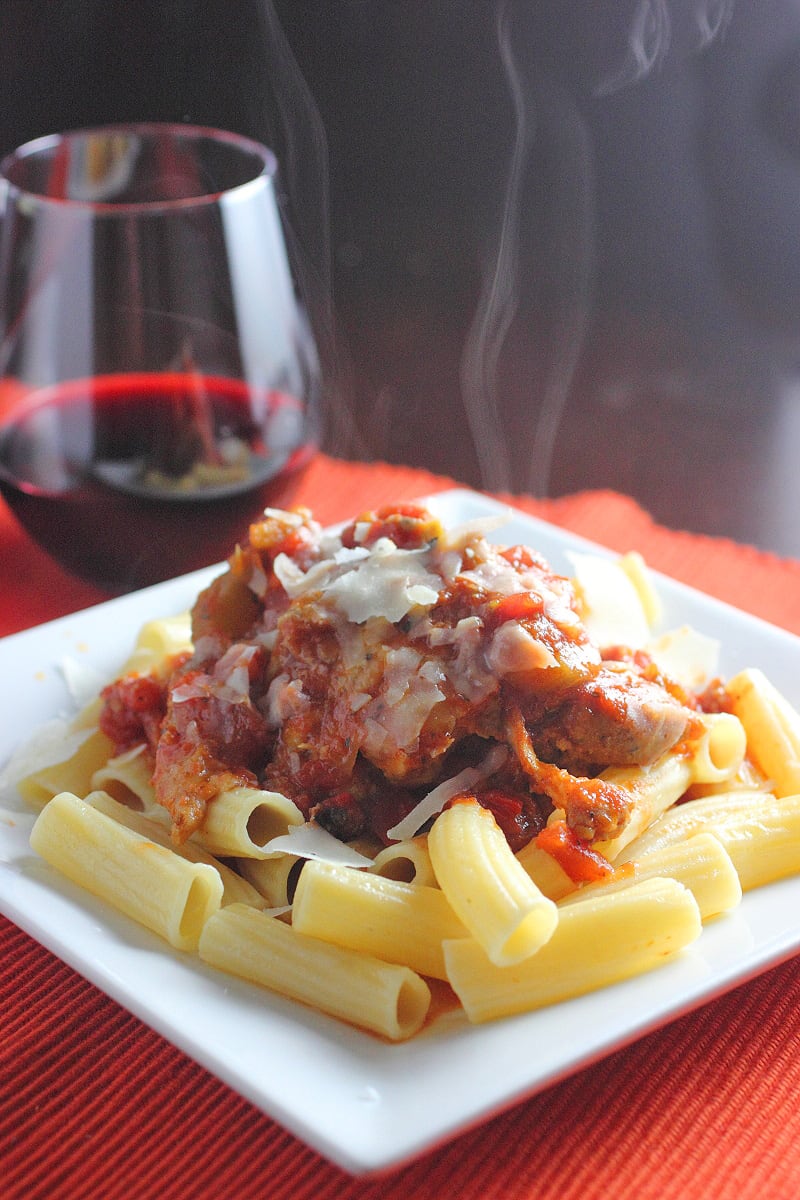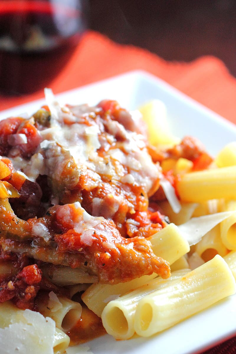 Until now, I have never had Chicken Cacciatore but let me tell you how amazing this dish is. First of all, it is perfect for colder months. Why do you wonder? That is because it is basically a chicken stew. A chicken stew with delicious plum tomatoes, an amazing pepper flavor, and you can serve it over your favorite pasta. This will go well with jumbo pasta such as rigatoni, egg noodles, or, in my case, I used tortellini. Basically, it’s like a bigger rigatoni pasta. I love big pasta because they are such fun to eat for me for some reason. Actually, I could eat a big bowl of pasta drizzled in olive oil, salt, garlic, oregano, topped off with some freshly grated Parmesan and I am a happy girl. But I am happier to have this Chicken Cacciatore dish on top of pasta instead. Give it a try and you will too!